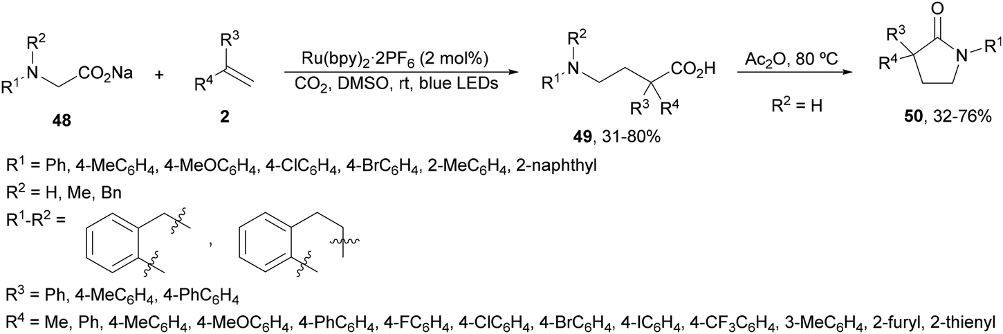 Tandem aminomethylation/carboxylation of styrenes with sodium glycinates 48 has been developed under Ru(bpy)3·2PF6 photocatalysis using CO2 (1 atmosphere) in DMSO at room temperature (Scheme 19).86 This methodology afforded α,α-disubstituted γ-amino acids 49 in moderate to good yields. In some cases Ir complex 4 was also used in place of the Ru complex. When the resulting products 49 were treated with acetic anhydride the corresponding γ-lactams 50 were obtained in moderate to good yields. This procedure represents a step forward in the development of atom-economical decarboxylative reactions.
