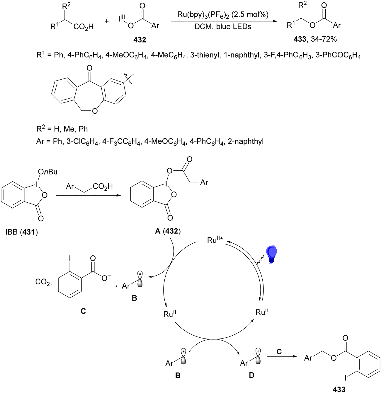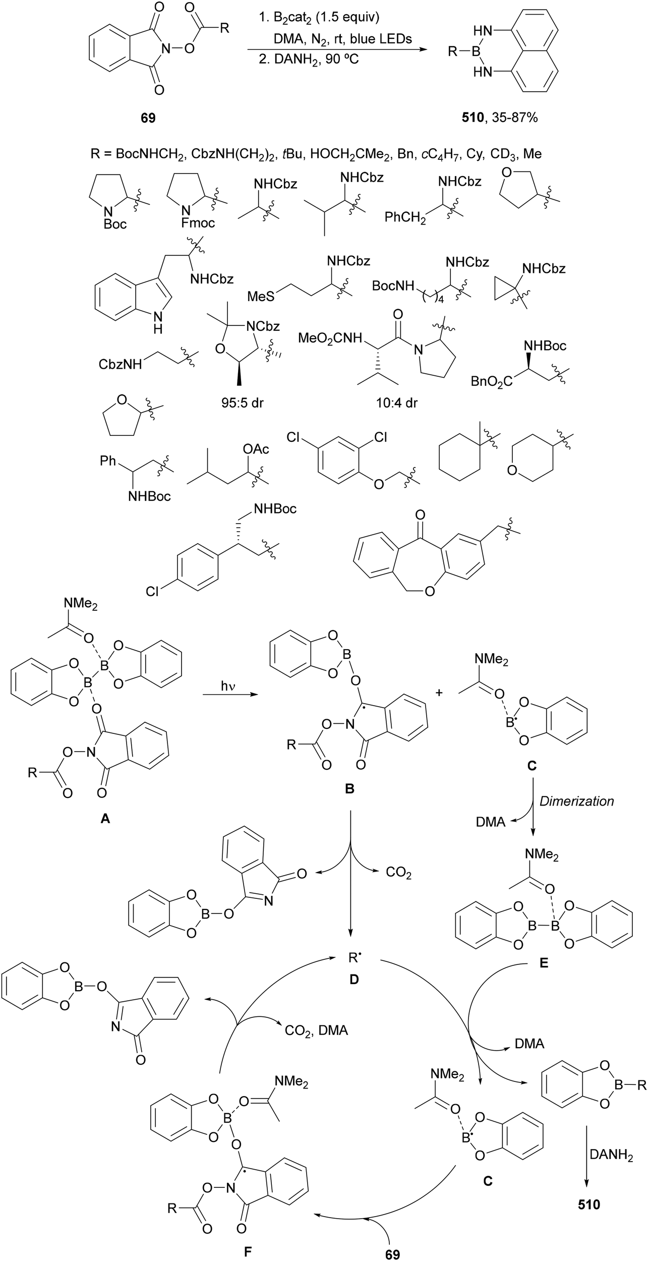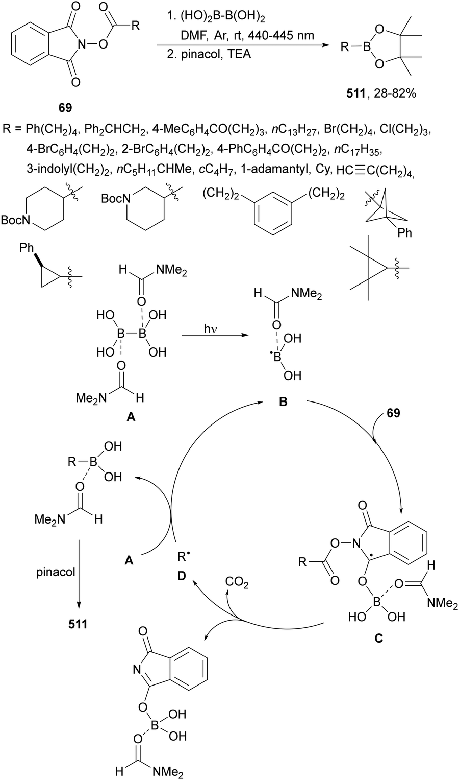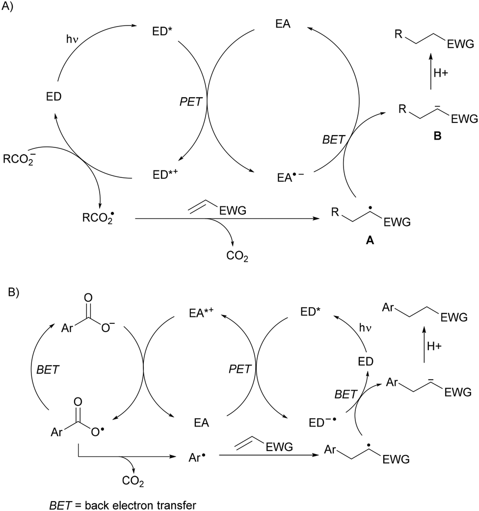 Recent applications of some of these organocatalysts will be considered. In the case of an arene as a photocatalyst and a dicyanoarene (DCA) as a redox mediator, Yoshimi and co-workers have reported the DGRs of aliphatic65,66 and aromatic67 carboxylic acids. In the first case, experiments conducted using phenanthrene (Phen) as the electron-donor (ED) and 1,4-dicyanobenzene as the electron-acceptor (EA) demonstrate photoinduced electron transfer (PET) from the ED to the EA, generating the radical cation of the ED, which oxidizes the alkyl carboxylate ion to form the carboxy radical able to generate the alkyl radical (Scheme 7A). When aromatic carboxylic acids are used, the EDs such as biphenyl (BP) and the EAs such as 1,4-dicyanonaphthalene (DCN) or 9,10-dicyanoanthracene (DCA) were used as photoredox catalysts (Scheme 7B). In the first case, the EA˙− undergoes back electron transfer (BET) to radical A generating anion B. In the second case, two BET processes occur in the oxidation of ED˙− to ED and of the carboxy radical to the anion.