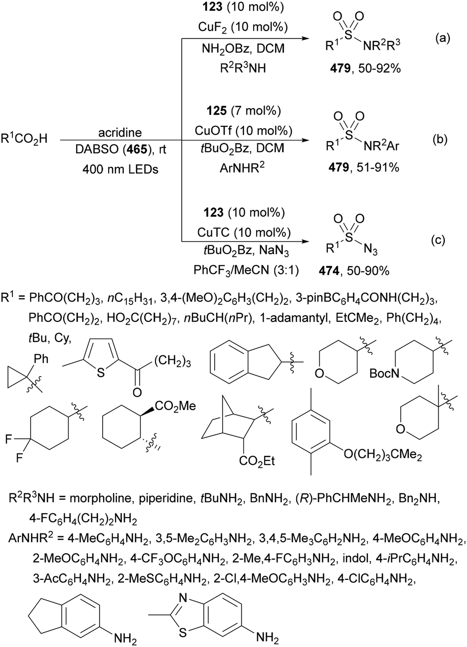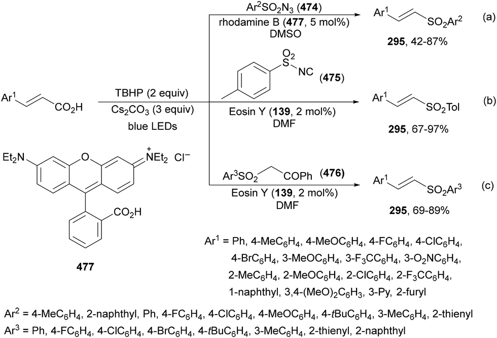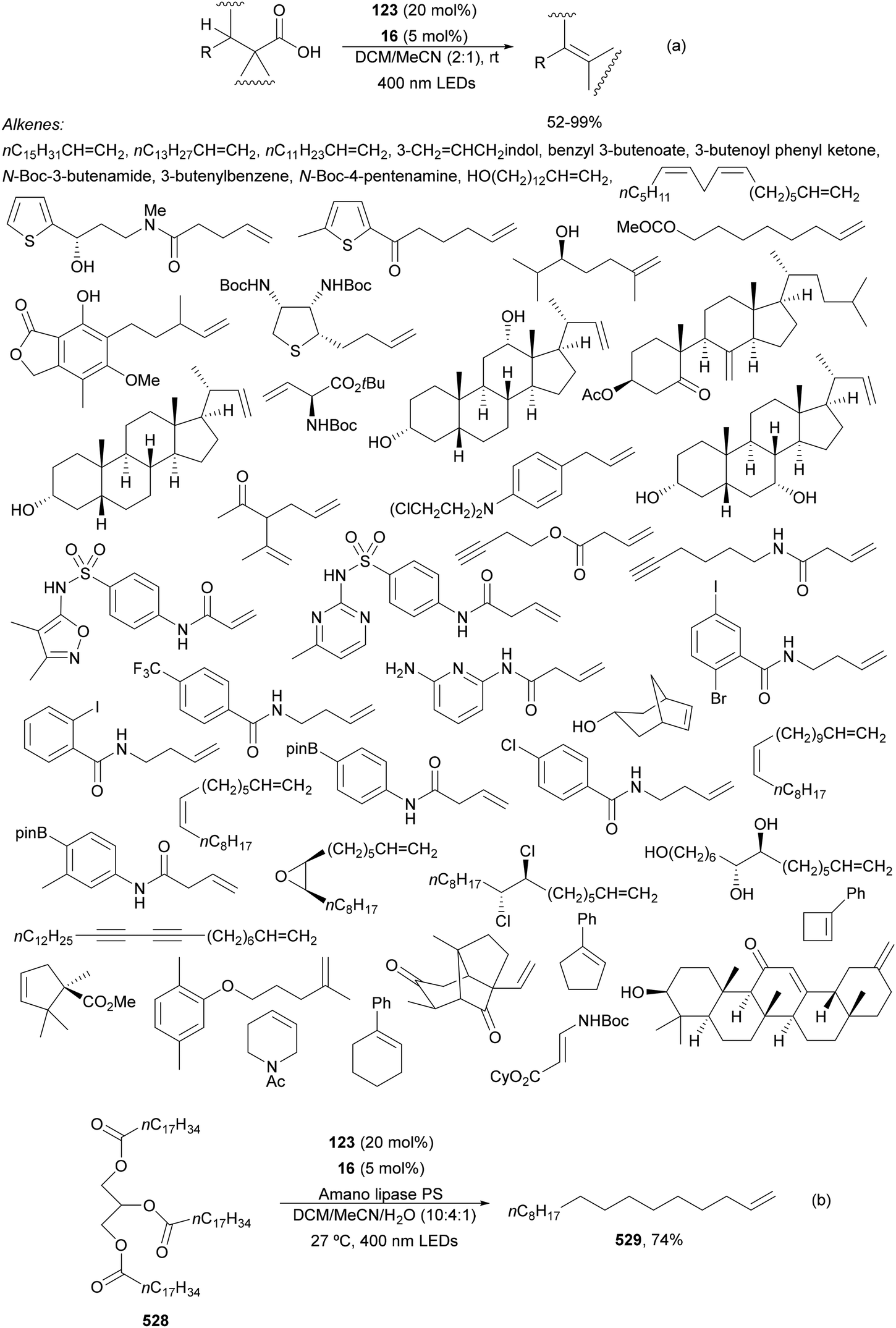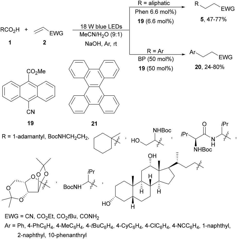 | Scheme 8 Decarboxylative Giese reaction of aliphatic and aromatic acids with electron-deficient alkenes under two organic photoredox systems. | ||