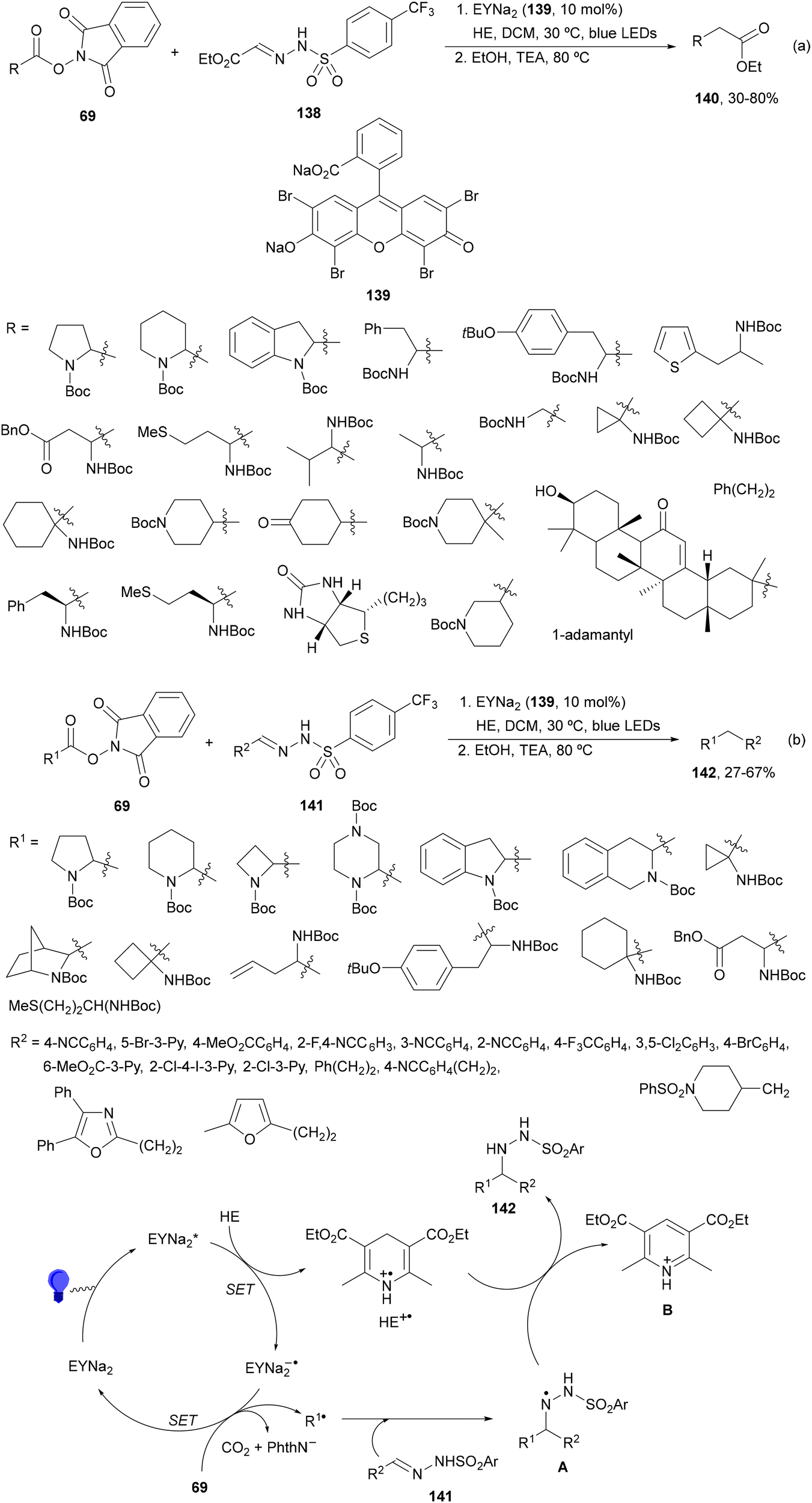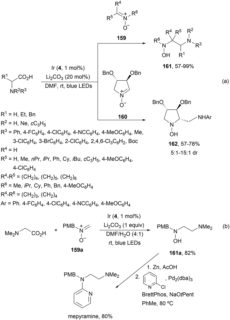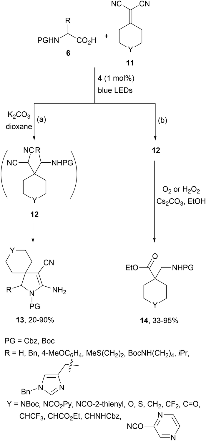 Gómez-Suárez and co-workers58 have described a two-step procedure for the DGR generating in situ11 as electron-poor alkenes. Starting from malononitrile and cyclic ketones the corresponding alkenes 11 were generated by Knoevenagel condensation followed by a domino DGR/base-mediated cyclization. Intermediate 12 was formed using Ir complex 4 as a photocatalyst and after cyclization the resulting spirocyclic products 13 were isolated in modest to good yields (Scheme 5a). The same group59 recently reported a two-step procedure based on a domino DGR/oxidative functionalization to obtain β2- and α-quaternary β1,2-amino acid derivatives 14 in good yields (Scheme 5b). In this case, the aminoalkylation DGR was also carried out in the presence of Ir[dF(CF3)ppy2(dtbbpy)]PF6 (4). This strategy has been scaled up via continuous-flow technology.