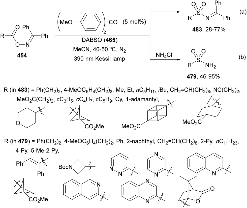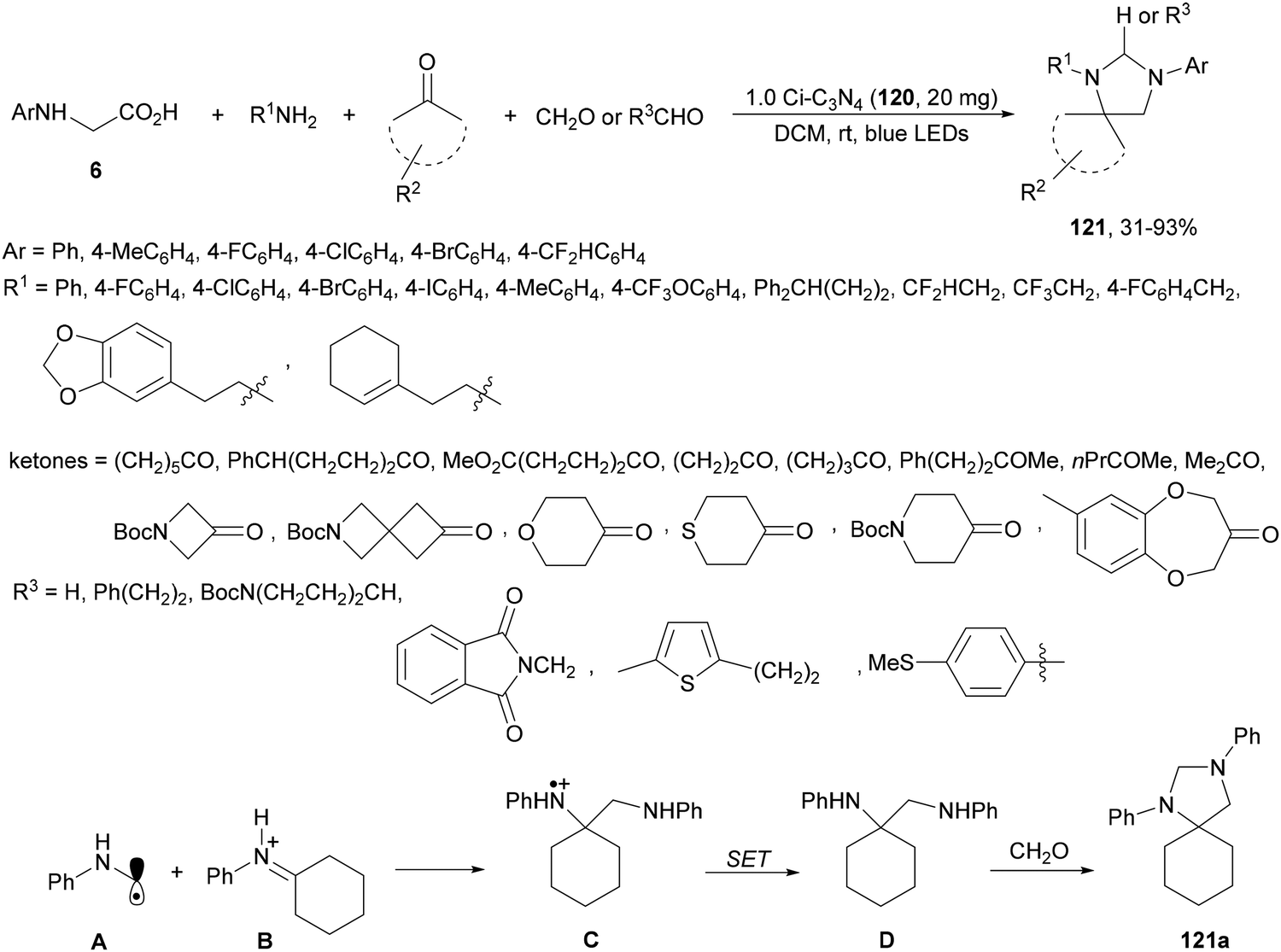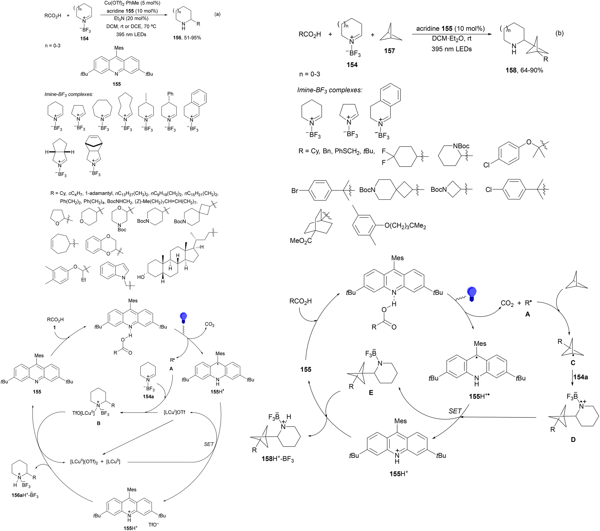 Gómez-Suárez and co-workers58 have described a two-step procedure for the DGR generating in situ11 as electron-poor alkenes. Starting from malononitrile and cyclic ketones the corresponding alkenes 11 were generated by Knoevenagel condensation followed by a domino DGR/base-mediated cyclization. Intermediate 12 was formed using Ir complex 4 as a photocatalyst and after cyclization the resulting spirocyclic products 13 were isolated in modest to good yields (Scheme 5a). The same group59 recently reported a two-step procedure based on a domino DGR/oxidative functionalization to obtain β2- and α-quaternary β1,2-amino acid derivatives 14 in good yields (Scheme 5b). In this case, the aminoalkylation DGR was also carried out in the presence of Ir[dF(CF3)ppy2(dtbbpy)]PF6 (4). This strategy has been scaled up via continuous-flow technology.