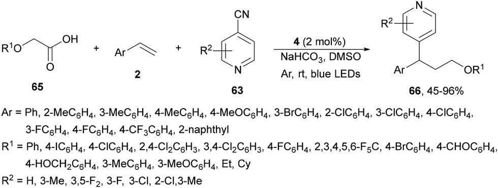 Recently, a similar three-component decarboxylative coupling reaction of α-aryloxyacetic acids 65, cyanopyridines 63 and styrene derivatives 2 provided pyridines 66 with good yields (Scheme 23).90 In this case, Ir complex 4 was the best PC, with NaHCO3 as a base in DMSO at room temperature under blue LED irradiation. This process was carried out in a gram-scale.