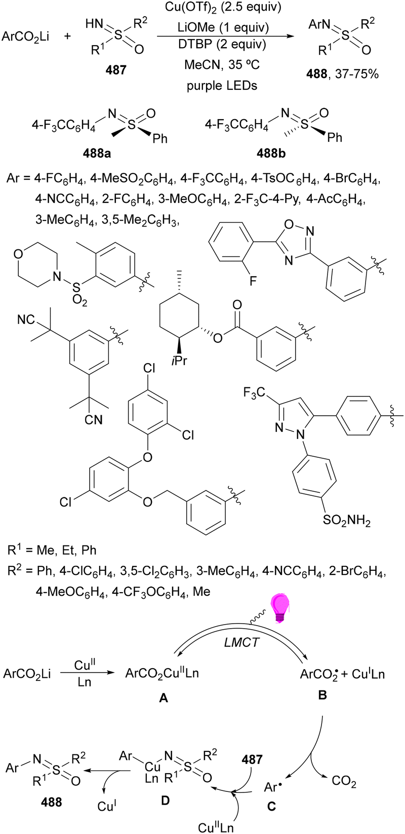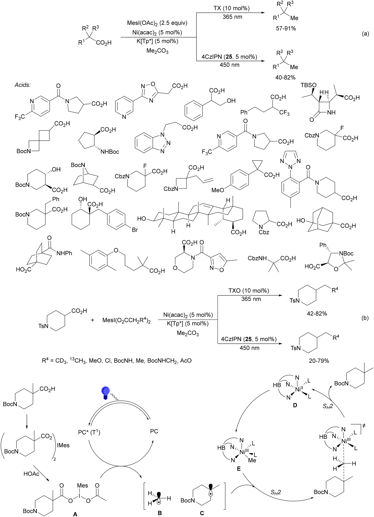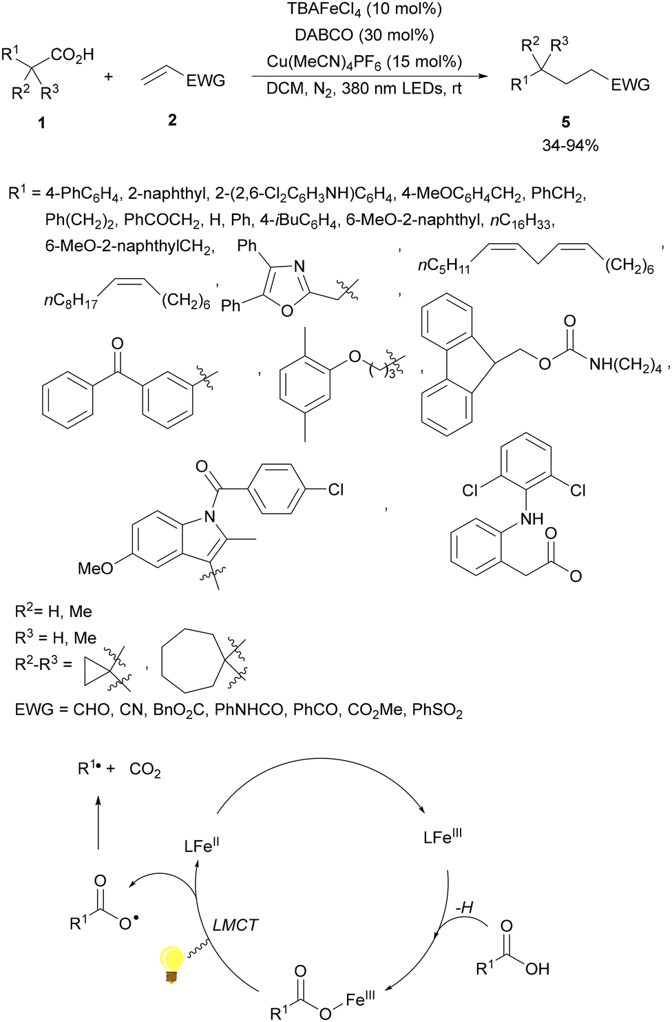 A dual catalytic system developed by merging iron/copper catalysis has been employed by the Li and Zeng group53 for the decarboxylative alkylation of electron-deficient alkenes with alkyl carboxylic acids. An iron catalyst, tetrabutylammonium tetrachloroferrate(III) (TBAFeCl4), and Cu(MeCN)4PF6 as a cocatalyst and 1,4-diazabicyclo[2.2.2]octane (DABCO) as a base in dichloromethane (DCM) and a N2 atmosphere at room temperature produced the desired products 5 by irradiation with a 390 nm LED lamp (Scheme 2). Several carboxylic acids including various types of drugs or natural products, such as diclofenac, oxaprozin, ibuprofen, naproxen, linoleic acid, oleic acid, carbamic acid, gemfibrozil, indomethacin, aceclofenac, ketoprofen and stearic acid, were used. As olefinic counterparts, acrolein, acrylodinitrile, acrylonitrile, methyl acrylate, acrylamide, phenyl vinyl ketone and vinyl sulfone were employed. Mechanistic studies supported a ligand-to-metal change transfer (LMCT)54,55 pathway of the iron catalyst, whereas the copper catalyst here might act as a Lewis acid activating the electron-deficient olefin and inhibiting the potential polymerization. The carbon radical was formed through the LMCT of the iron catalyst followed by decarboxylation.