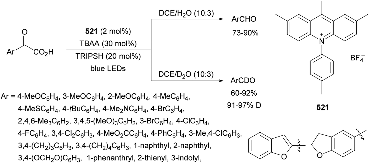 | Scheme 13 Decarboxylative Giese reaction of α-keto acids 15 and maleic anhydrides 31 using [Mes-Acr-Ph]+BF4− (17) as the photocatalyst. | ||