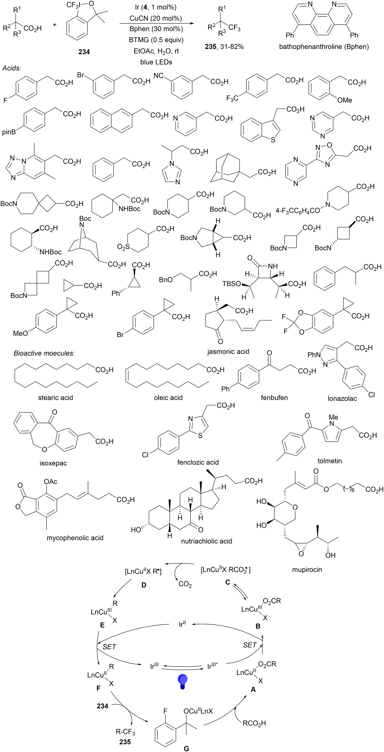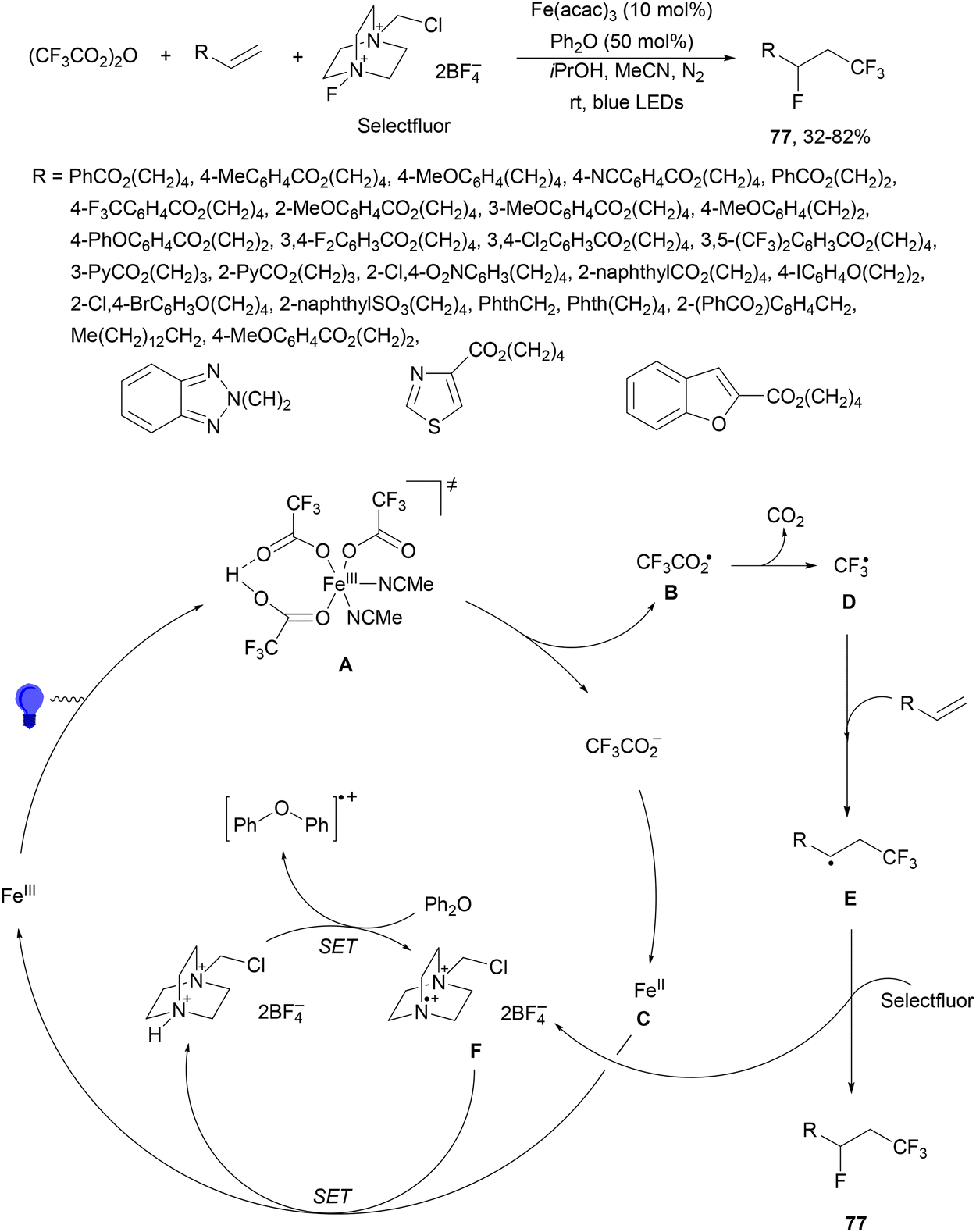 In the presence of a Brønsted acid, the formation of iron LMCT54,55 was facilitated for the activation of haloalkylcarboxylates (CnXmCO2−, X = F or Cl) to produce CnXm radicals.94 Unactivated terminal alkenes reacted with trifluoroacetic anhydride, Selectfluor, diphenyl ether and Fe(acac)3 as a catalyst in isopropanol and MeCN under a N2 atmosphere and blue light irradiation to form products 77 with moderate to good yields (Scheme 27). A wide variety of APIs were subjected to this Brønsted acid-unlocked iron LMCT photocatalysis. According to mechanistic studies, the photodecomposition of in situ-generated Fe(CF3CO2)3 occurred only under acidic conditions. In the proposed mechanism, the Fe(III) photoactive species, after irradiation through TS A, gives CF3CO2 radical B and Fe(II) intermediate C. After decarboxylation of B, the desired CF3 radical D is trapped by the alkene to form radical E, which is fluorinated by Selectfluor to give product 77. The generated N-radical cation F required the regulation by the redox buffer diphenyl ether to avoid the formation of C–N bonds.