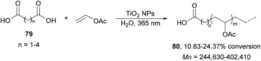 Radical polymerization of alkenes initiated by photocatalytic decarboxylation of carboxylic acids has been performed by Liao and Ni95 using titanium oxide nanoparticles (NPs) as a photocatalyst. The polymerization of vinyl acetate was achieved with carboxylic diacids 79 in aqueous media (Scheme 28). The rate of this polymerization depends strongly on the diacid structure and it was found that diacids with an even carbon number polymerized faster. This process was carried out in a reactor using a mercury vapor lamp at a frequency of 365 nm during 3 hours with 0.2% wt of TiO2. The number average molecular weight (Mn) of PVAc 80 ranges from 240 to 400 kDa and the molecular weight distribution ranges from 1.96 to 2.63.