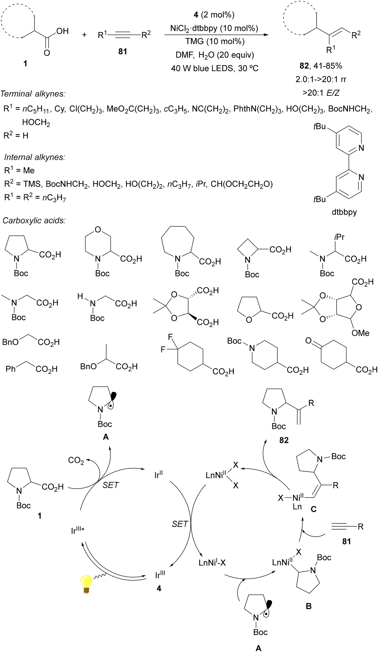 | Scheme 29 Decarboxylative hydroalkylation of unactivated alkynes 81 and carboxylic acids under Ir/Ni photoredox catalysis. | ||