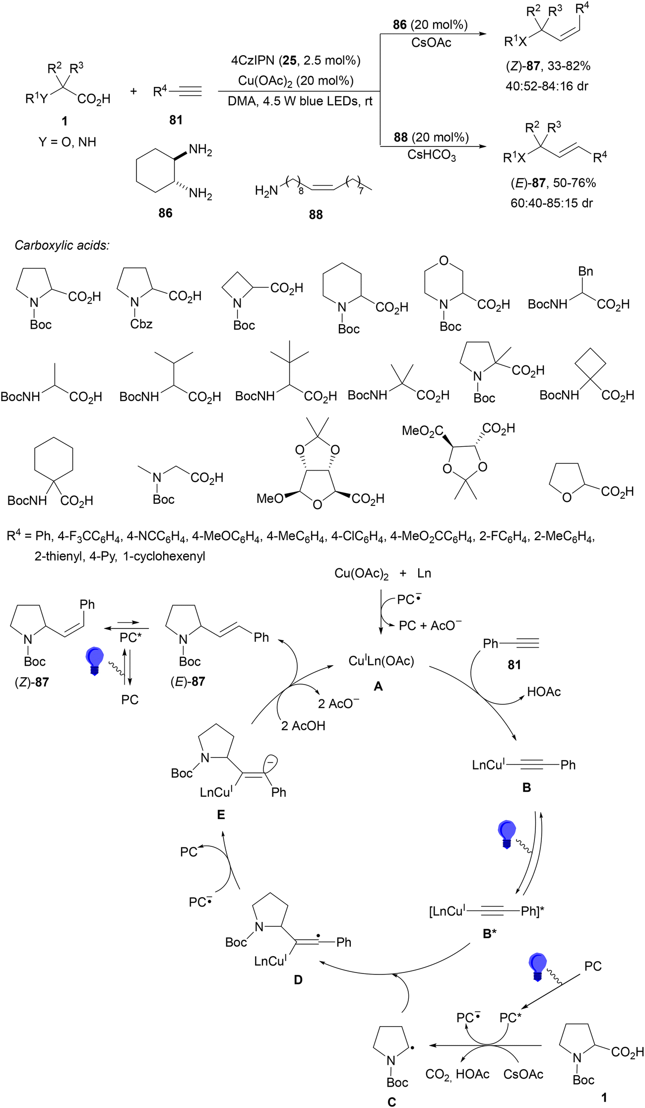 Pericàs and co-workers98 performed the decarboxylative stereodivergent99 hydroalkylation of alkynes using copper instead of nickel and 4CzIPN (25) instead of an Ir complex as a photoredox catalyst. By a multivariate high-throughput experimentation (HTE) approach different carboxylic acids, including AAs and α-oxy acids, reacted with terminal alkynes 81 using Cu(OAc)2, diamine 86 as a ligand, CsOAc as a base and DMA as solvent and blue LED at room temperature (Scheme 31). The resulting (Z)-alkenes 87 were obtained with moderate stereoselectivity. On the other hand, (E)-alkenes 87 were formed by changing ligand 86 to oleylamine (88) and using CsHCO3 as a base. In the proposed mechanism, upon irradiation of the PC the Cu(II) complexes were reduced to Cu(I) A and also the carboxylate ion was oxidized to radical C, which underwent decarboxylation. The Cu(I) complex A generates acetylide B, which after photoexcitation gives the species B* with a depletion of charge on the alkyne moiety through ligand-to-metal charge transfer (LMCT)54,55 accelerating the attack of the radical C to form the vinyl radical D. Subsequent oxidation of PC−˙ by D provides vinyl anion E, which after protonation and proto-demetallation of the Cu–C bond gives enriched (E)-87, generating the Cu(I) species. Isomerization of (E)-87via energy transfer (ET) mediated by the PC provides (Z)-87.