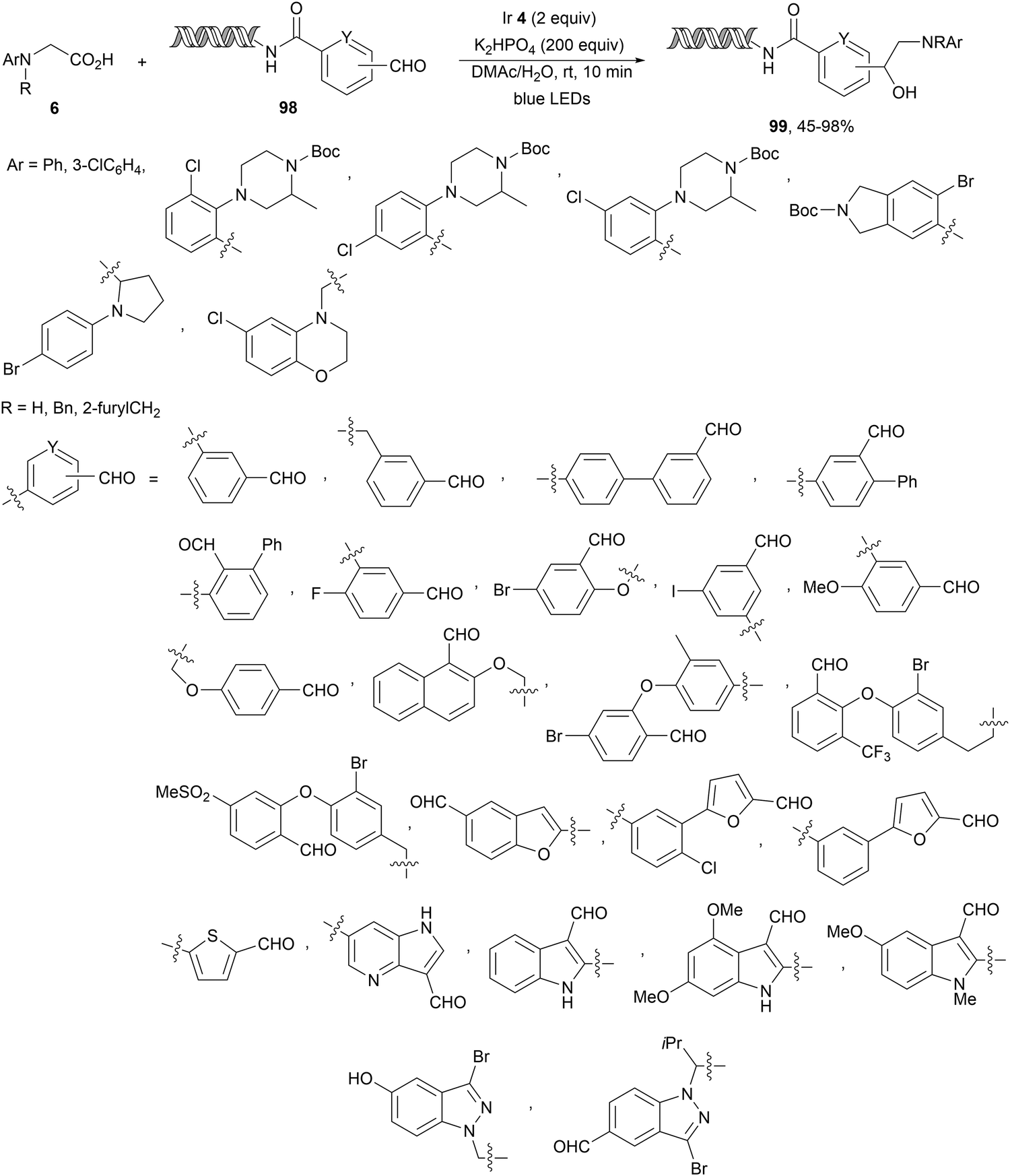 In the case of DNA-conjugated aldehydes 98, the photoredox-mediated decarboxylative coupling with α-amino acids provided DNA-encoded 1,2-amino alcohols 99 (Scheme 35).106 This reaction proceeded for a wide range of aldehydes but also for ketones with conversions >50% using Ir complex 4 as a PC and K2HPO4 as a base in aqueous DMAc at room temperature in only 10 minutes irradiation time.