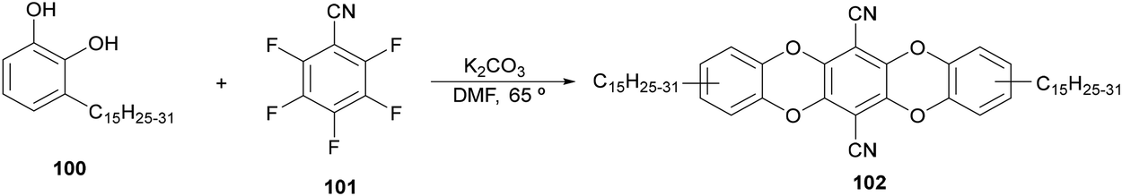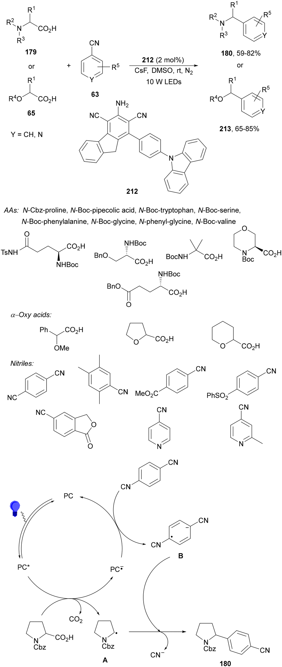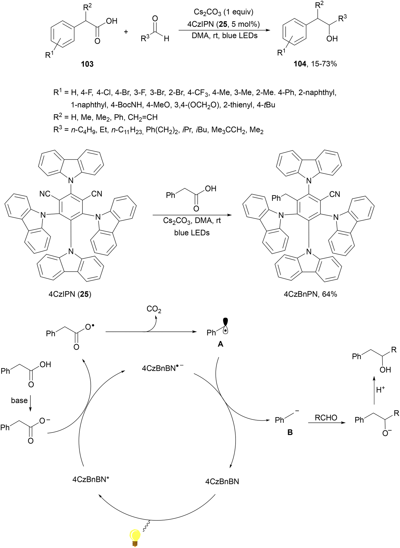 For the synthesis of 1,2-amino alcohols by decarboxylative coupling of α-amino acids with aldehydes an urushiol derivative 102 has been used as a photocatalyst by Zhang and co-workers.107 This PC was prepared from urushiol 100 and 2,3,5,6-tetrafluorotherephthalonitrile (101) in the presence of K2CO3 (Scheme 36). Due to the photoredox properties of 102 it was used in MeCN as solvent with NaHCO3 as a base at room temperature under blue LED irradiation to obtain 1,2-amino alcohols 97 with modest to high yields (16–93%). This biomass-based PC exhibits absorption in the visible region (λmax = 426 nm) and its half-wave potentials were +1.17 and −1.24 V, which can be assigned to 102−˙/102 and 102/102−˙, respectively, according to cyclic voltammetry measurements.