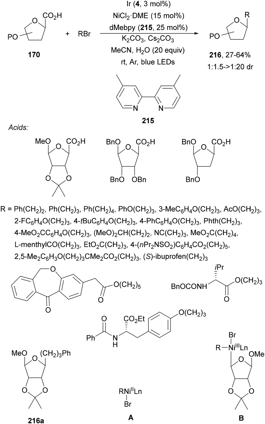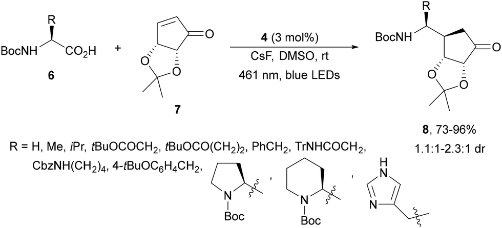Jung and co-workers56 performed the photoreductive β-aminoalkylation of an α,β-unsaturated carbasugar mimic 7 driven by blue LEDs light using 4 as an Ir photocatalyst (Scheme 3). Different N-Boc α-amino acids 6 reacted with the cyclopentenone derivative 7 in DMSO at room temperature to provide γ-amino ketones 8 with very good yields and moderate diastereoselectivity. The resulting products 8 were transformed into 5′-amino carbasugar nucleoside analogues for S-adenosyl methionine-based methyltransferase inhibitors.