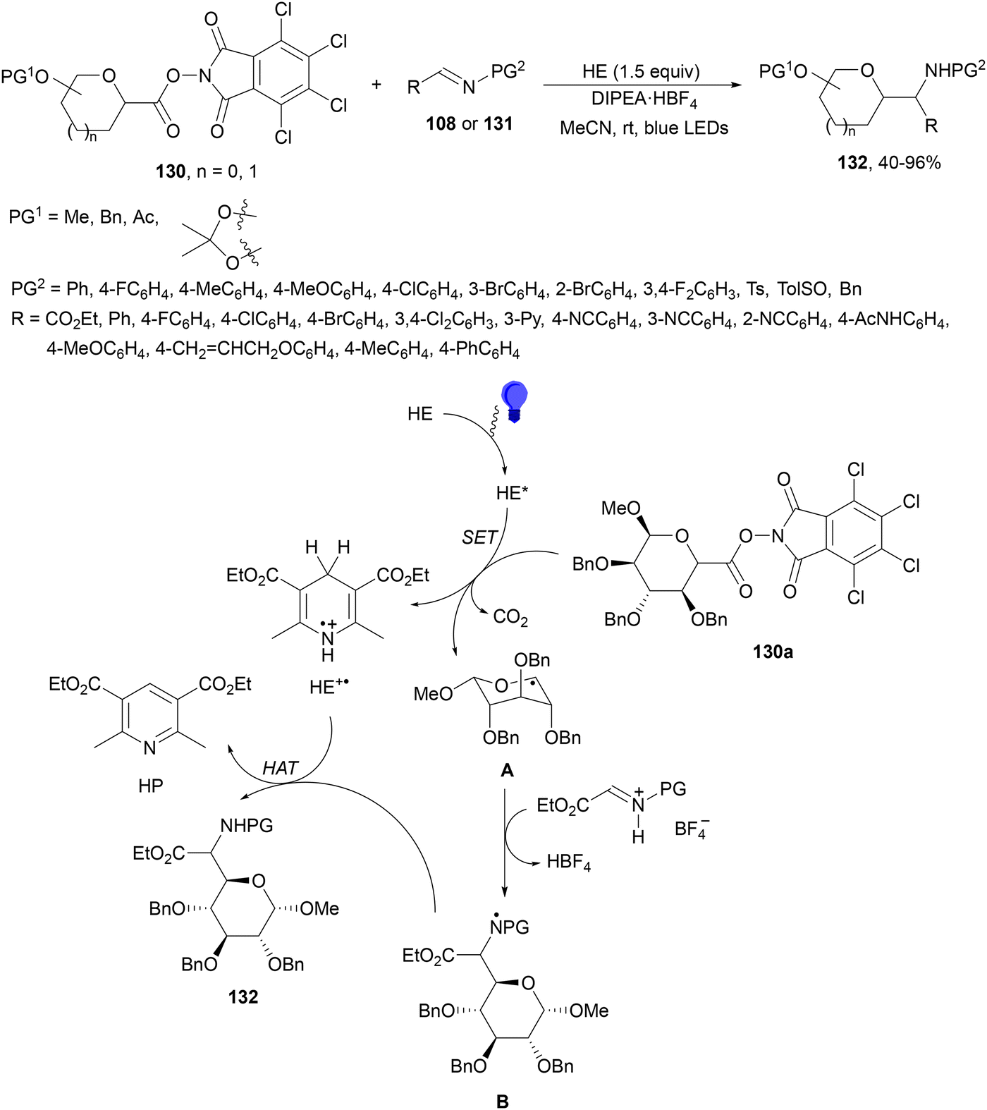 1 dr). In the case of starting compounds 39, containing dipeptides and tripeptides, the corresponding mannofuranosyl peptides 41 were obtained in 34–65% yields with excellent anomeric selectivity. According to mechanistic studies a proposed mechanism is depicted in Scheme 16. The excited PC* promotes the SET oxidation of ester 37 to intermediate A followed by homolysis to the alkoxycarbonyl radical B and Hantzsch pyridine C. After decarboxylation of B, glycosyl radical D is formed, which adds to 38 giving radical E. Radical E undergoes SET with the reduced PC˙− to yield, after protonation, product 40.