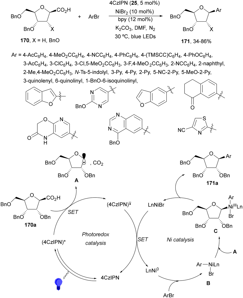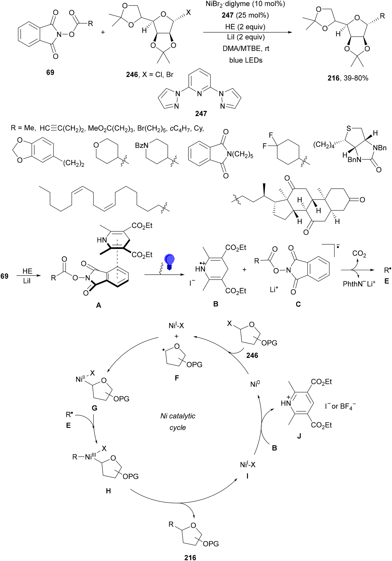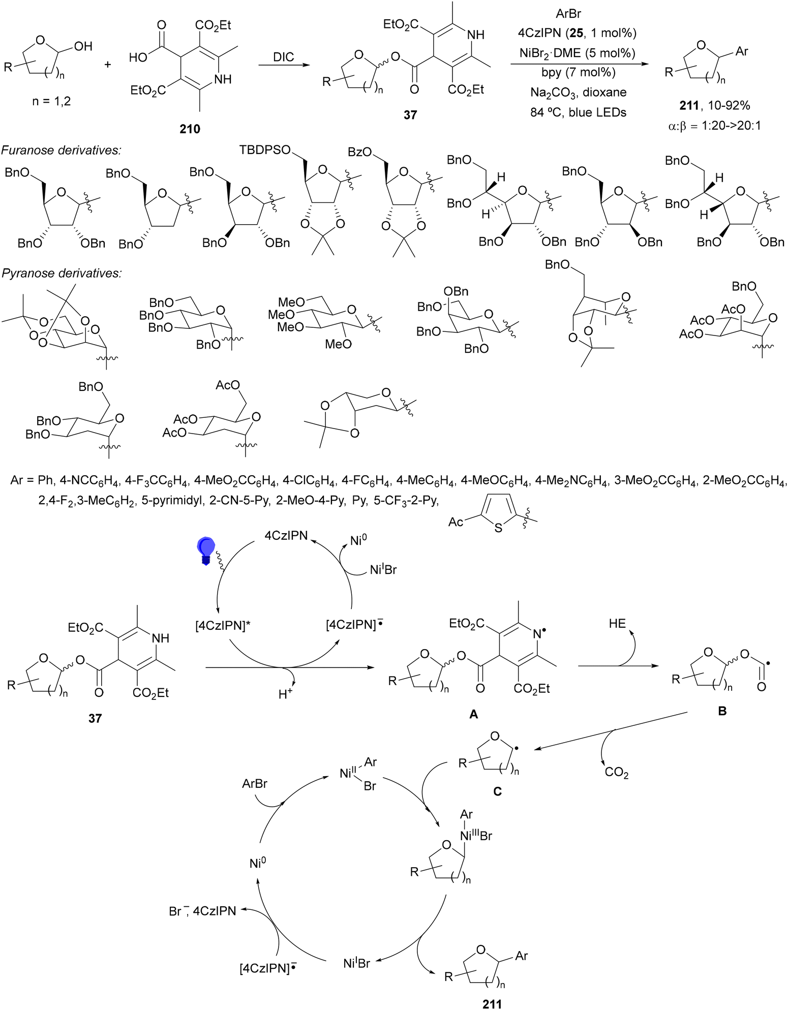 | Scheme 17 Decarboxylative Giese reaction of unprotected glycosyl DHP esters 42 and Michael acceptors under 4CzIPN (25) photocatalysis. | ||