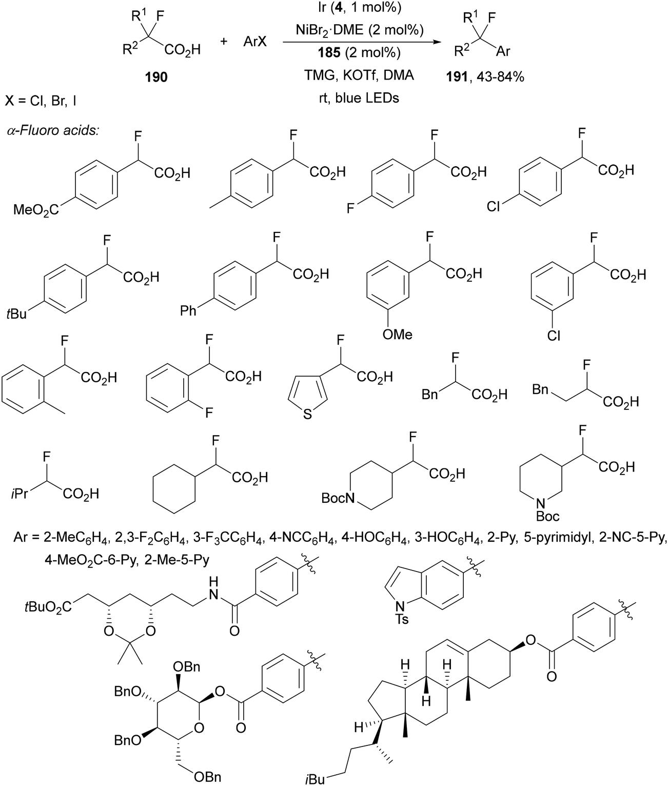 | Scheme 25 Decarboxylative hydrofluoroalkylation (a, b) of alkenes under Fe(OAc)2 or Fe(NO3)3 and TRIPSH photocatalysis. | ||