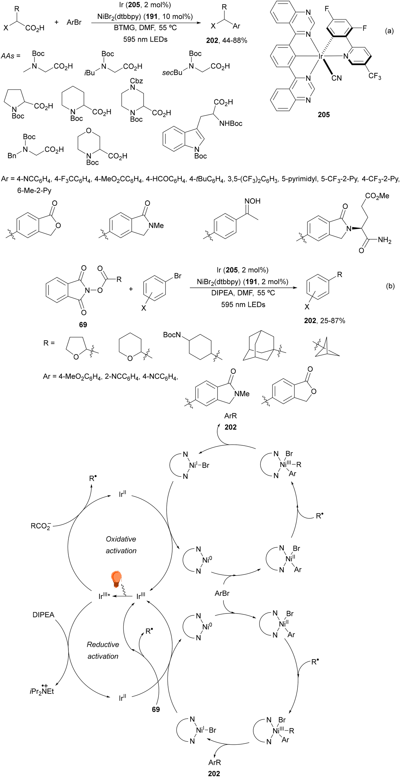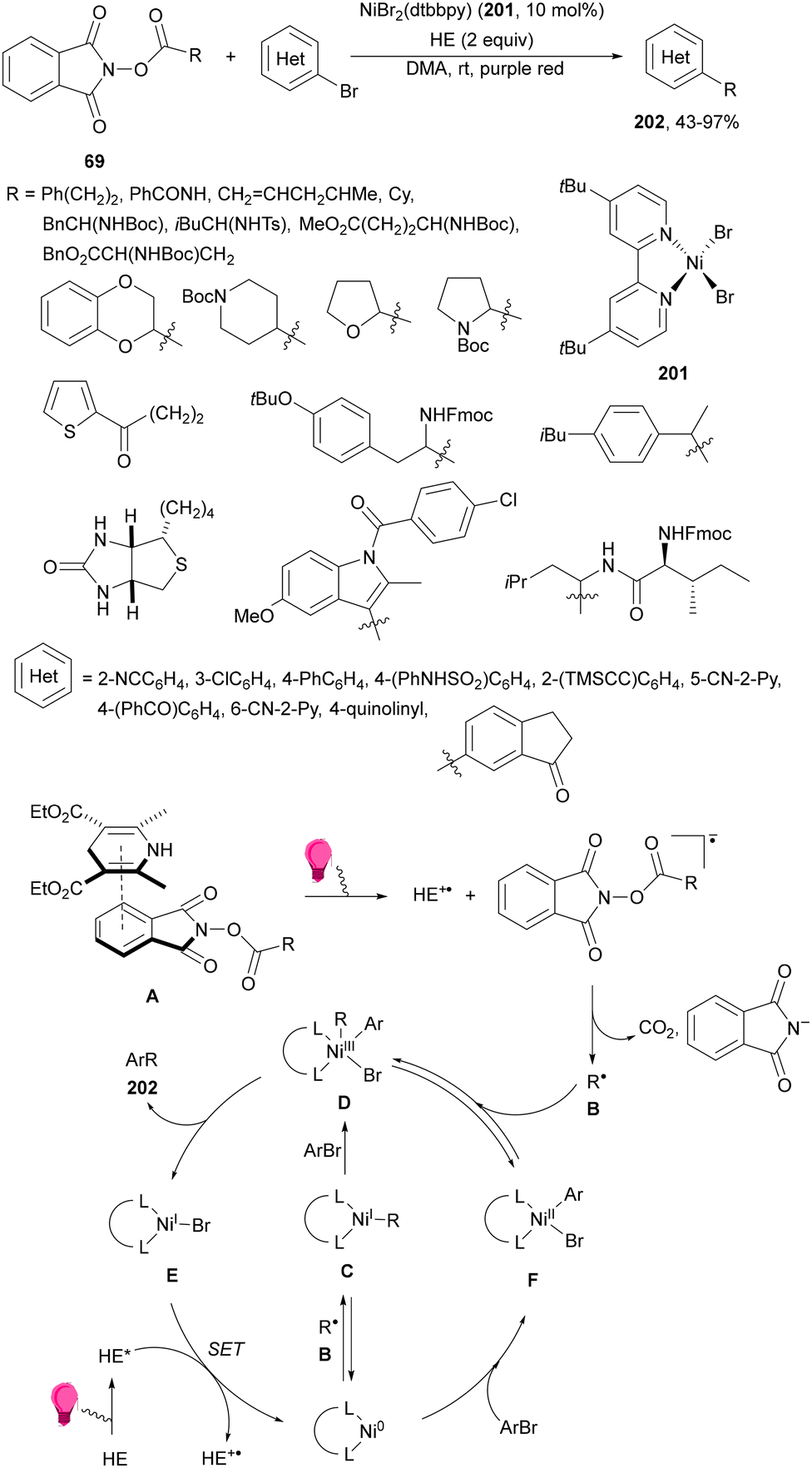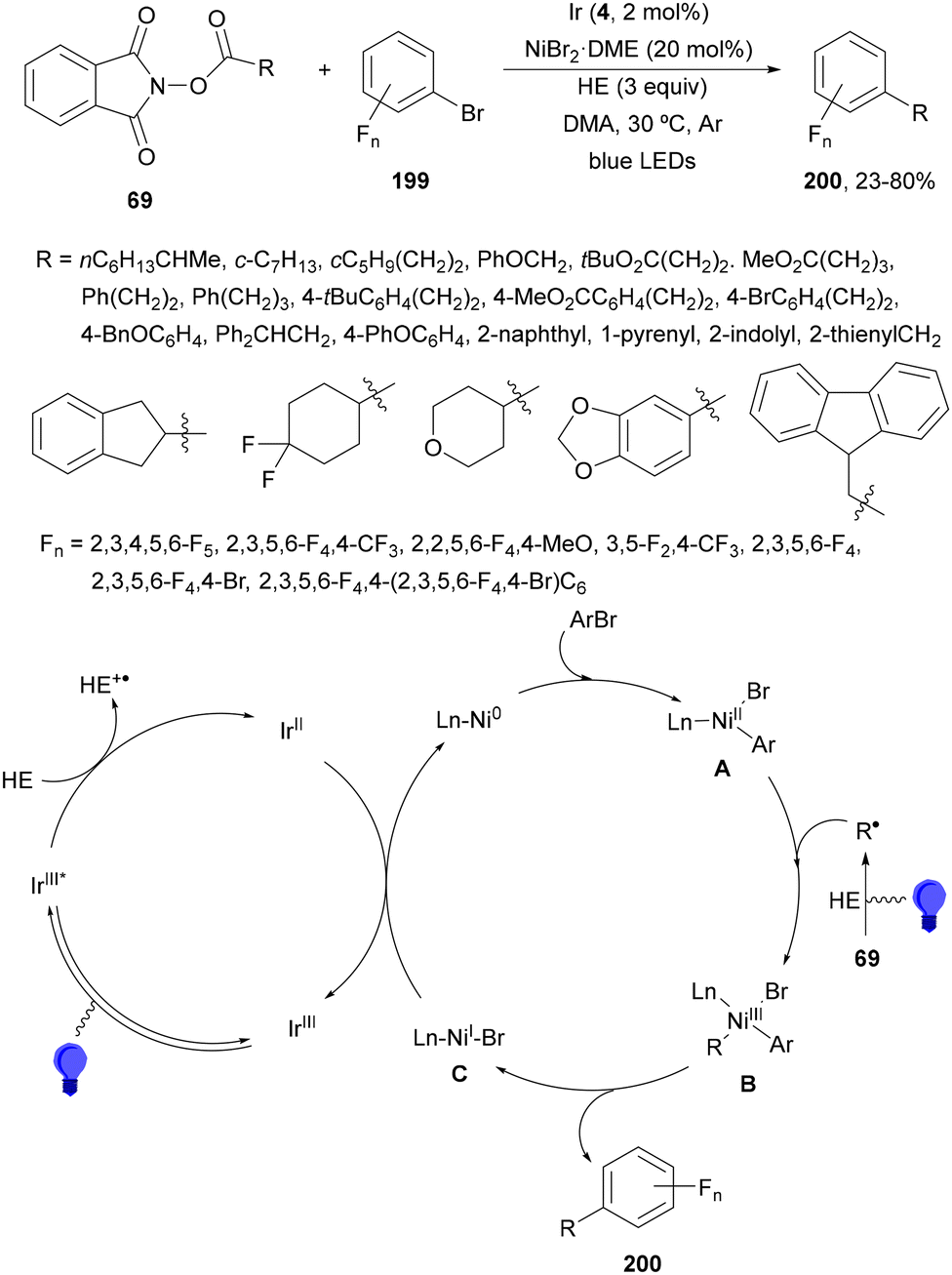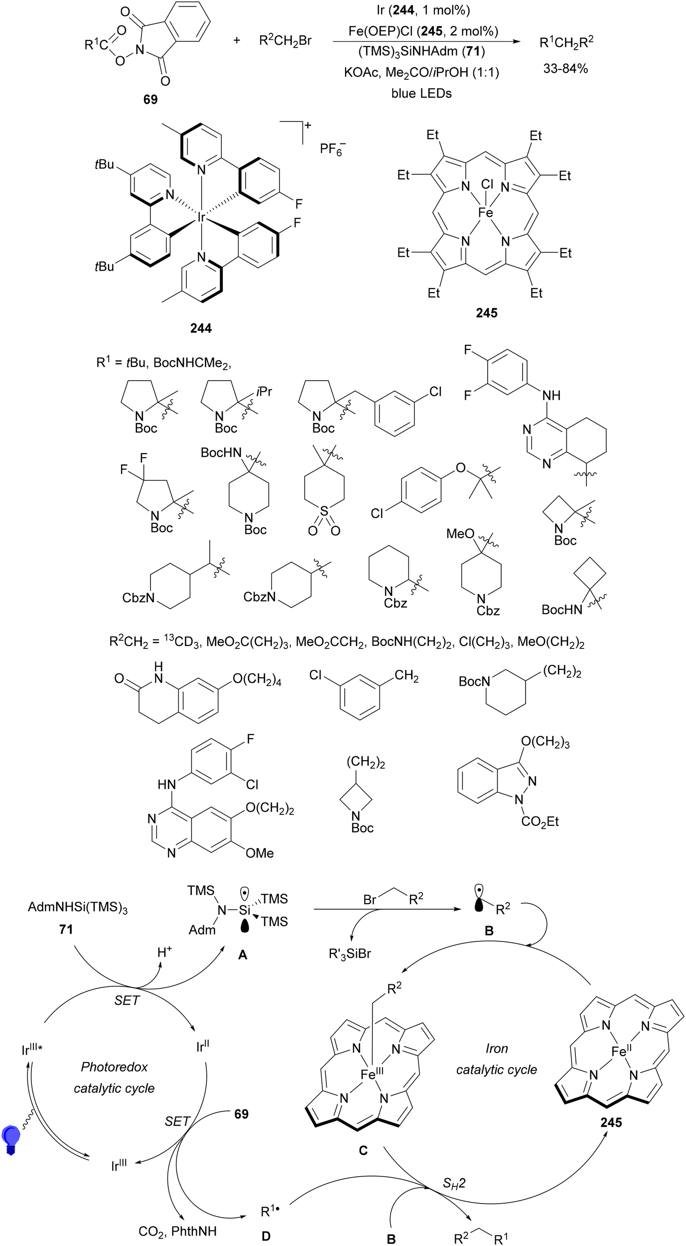 | Scheme 24 Aryl-alkylation of unactivated alkenes 67 with aryl bromides 68 and NHPI esters 69 using Admnsilane 71, Ir 4 and Ni (70) complexes as photoredox catalysts. | ||