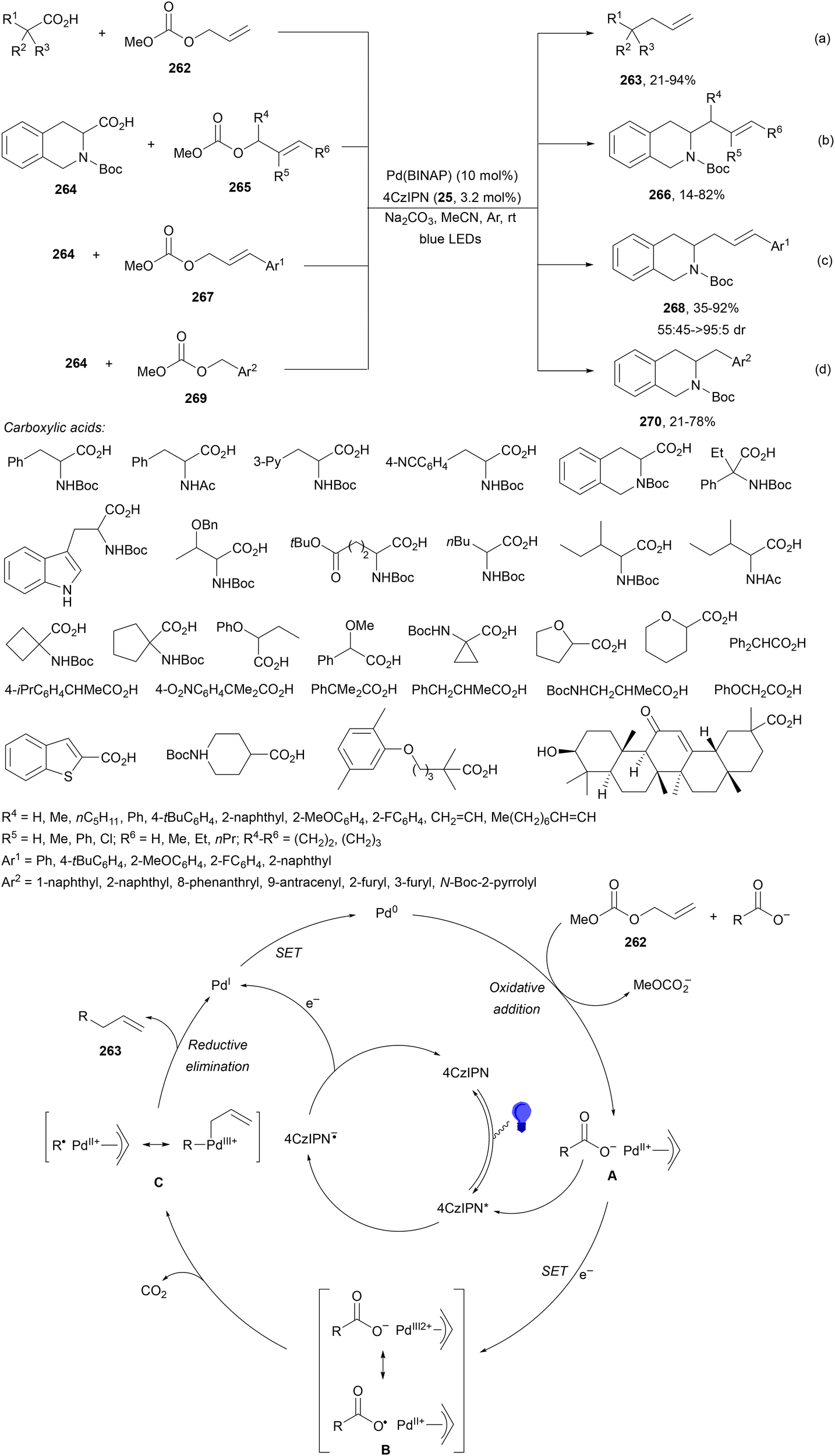In the case of allenes, a dual Pd/photoredox-catalyzed regio- and enantioselective decarboxylative hydroalkylation with N-aryl AAs has been recently reported by Breit and co-workers.87 When 1-alkoxyallenes 51 were hydroalkylated using Ir complexes 52 or 53 in the presence of 4-CF3C6H4CO2H and Feringa's phosphoramidite 54 as a chiral ligand syn-1,2-amino ethers 55 were obtained in good yields with good diastereo- and enantioselectivities under blue LED irradiation (Scheme 20a). The Ir catalyst gave better results than 4CzIPN. This transformation starts by oxidative addition of Pd(0) to the AA giving the palladium hydride species A. Migratory insertion of A into the allene forms the π-allyl palladium species B, which via a reductive quenching process of the excited Ir(III)* complex provides intermediate C. Subsequent SET from the carboxylate ion to Pd facilitates the decarboxylation step resulting in intermediate D. Final reductive elimination forms the product and the Pd(I) species, which is reduced by the Ir(II) complex. With monosubstituted allenes 56 linear decarboxylative hydroalkylation took place with N-aryl AAs using rac-BINAP (57) as a ligand for Pd to provide homoallyl amines 58 with good yields and regio- and E/Z-diastereoselectivities (Scheme 20b).