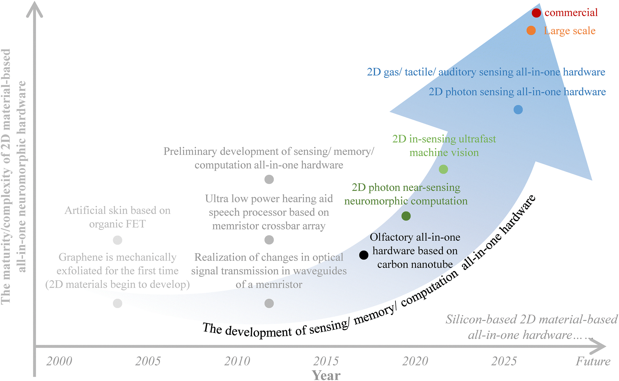 The exponential growth of data in the era of big data has led to a surging demand for computing power that outpaces the current pace of expansion in traditional computing architectures. Non-von Neumann architectures have emerged as a promising approach to address this challenge. Concurrently, two-dimensional (2D) materials have garnered significant attention due to their unique properties, including high carrier mobility, excellent physical responsivity (to photons, gases, tactile stimuli, etc.), and the potential for integration with complementary metal–oxide–semiconductor (CMOS) technology. This review article provides a comprehensive overview of the development of 2D material-based sensing devices catering to various human senses, as well as the integration of such devices with computation and memory units. Furthermore, the review delves into the recent advancements in 2D material-based sensing, memory, and computation all-in-one arrays, highlighting their potential for realizing human-mimicking data processing technologies. The perspective underscores the promising avenues and potential applications of 2D materials integrated with CMOS technology in shaping the future landscape of neuromorphic computing and sensory-cognitive systems.