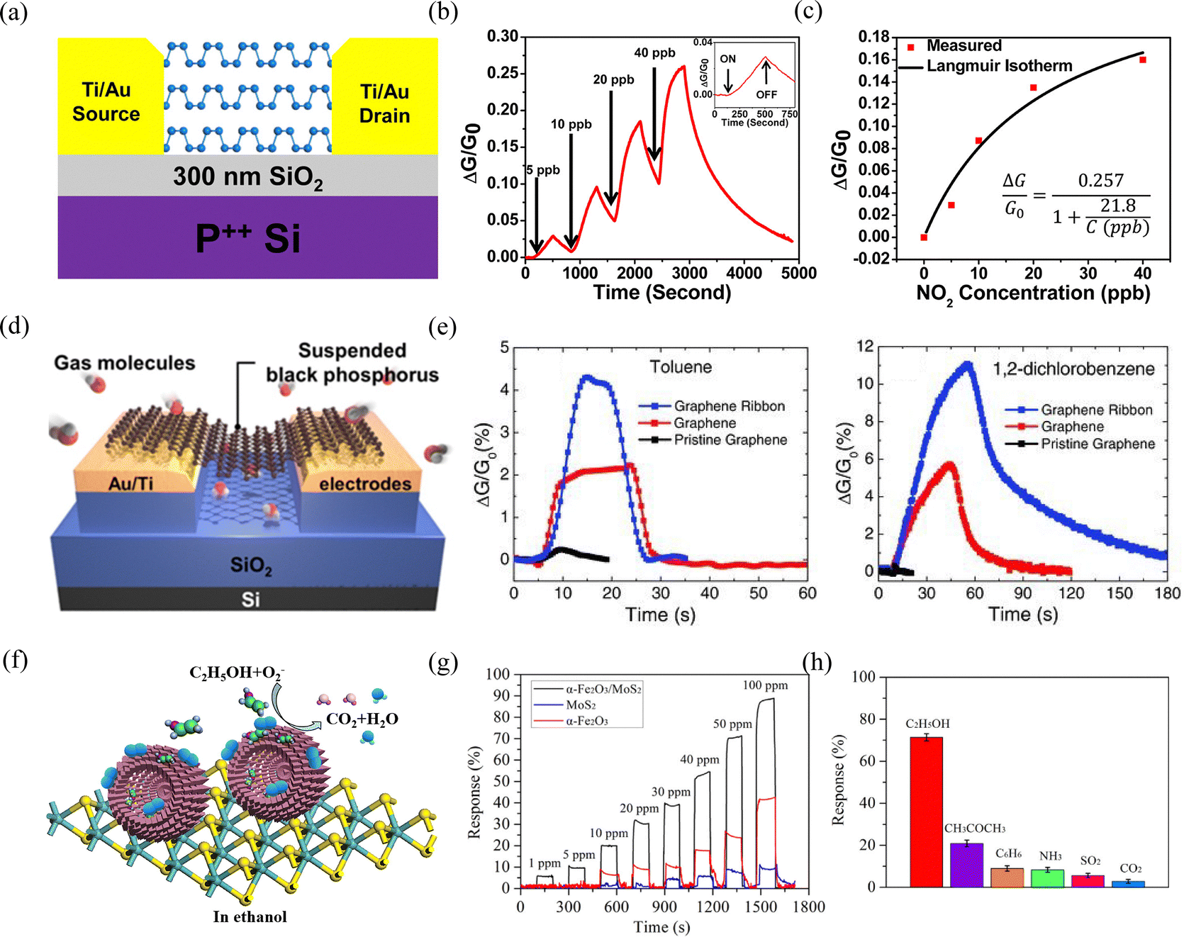 Inspired by previous theoretical studies,111 Abbas et al. first fabricated the FET-type BP gas sensor for NO2 detection in 2015 (Fig. 4(a)).82 The multilayer BP gas sensor exhibits a clear conductance change at NO2 concentrations as low as 5 ppb, demonstrating sensitivity superior to other 2D material-based gas sensors112 (Fig. 4(b)). Moreover, the gas-sensing performance, fitted with the Langmuir isotherm, further confirms that charge transfer is the dominant mechanism for NO2 sensing in multilayer BP devices (Fig. 4(c)). In the same year, Cui et al. also demonstrated that the FET-type BP gas sensor is sensitive to NO2 at ppb levels.113 On the other hand, Donarelli et al. reported a chemiresistor-type BP gas sensor, innovatively designed to detect NO2, NH3, and H2 but not CO and CO2, using liquid-phase exfoliated BP flakes deposited on Si3N4 substrates.114,115 Moreover, in 2017, a novel suspended BP gas sensor was proposed to enhance the sensitivity of BP-based devices by modifying their intrinsic structure (Fig. 4(d)).83 The study demonstrated that the suspended-structure gas sensor exhibits higher sensitive than the substrate-supported gas sensor due to its high surface-to-volume ratio, adsorption areas on both sides and neglected substrate effects,116 resulting in a higher gas response in suspended 2D material structures. To further enhance BP sensitivity, heterostructure BP-based gas sensors, such as few-layer BP–MoS2 flakes vdW heterostructure,117 have been designed currently.