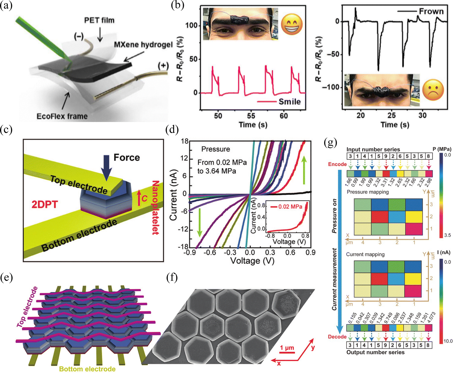 As one of the mainstream 2D materials in the field of tactile sensing, MXenes have played an important role in developing tactile sensors. Their multilayer stacking structure, or the single-layer thin sheet combined with a flexible (viscous) polymer, results in changes in interlayer spacing under pressure or tension. These variations in spacing lead to corresponding changes in conductivity (or resistance), making MXenes an ideal candidate for piezoelectric sensors. Ding et al. provided a comprehensive review and discussion of MXenes-based tactile sensors, exploring various approaches and introducing different sensing mechanisms for each category of these sensors.127 First, piezoresistive pressure/strain sensors operate based on four different mechanisms.129,130 Second, MXenes are widely used as electrodes in capacitors due to their excellent conductivity, which enhances their application in capacitive strain/pressure sensors.131,132 Third, there is a growing demand for self-powered strain/pressure sensors, including triboelectric and piezoelectric sensors based on MXenes, driven by the high power consumption of external sources.133,134