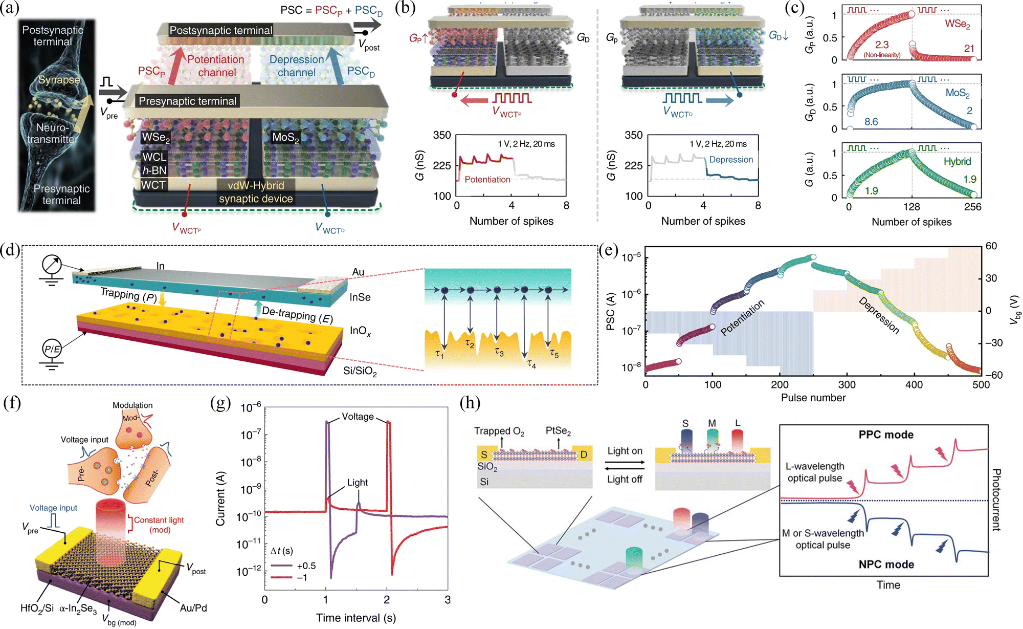 Recently, for the perspective of material design and optimization, a novel device leverages intrinsic out-of-plane polarization in Nb3Cl8's breathing-Kagome lattice to create electrically reconfigurable polarity potentials and enables nonvolatile charge transport that mimics biological synaptic plasticity with exceptional fidelity with robust operation across an extreme temperature range (150–300 K), further establishing polarization engineering in 2D materials as a transformative paradigm for developing energy-efficient, biologically realistic neuromorphic systems capable of operating in harsh environments.226 Besides, a defect-engineered 2D Bi2Se3 optical synaptic device, achieving bio-inspired visual memory and synaptic plasticity through persistent photoconductivity and combining optical sensing, memory, and processing in one single unit, exhibits tunable short-to-long-term memory transitions (60–486 s decay times) and nonvolatile behavior by introducing selenium vacancies via thermal treatment.227 Moreover, a simple double-ended optoelectronic device consisting of CuInP2Se6 realizes neuromorphic functions by being fully optically modulated, exhibiting a tunable photoresponse in the visible spectrum (400 to 700 nm) and capable of bi-directional conductance modulation in response to a light stimulus with 300 discrete conductance states in red, green, and blue light with high linearity for extraction, processing, and recognition of color-specific image features across three channels, driven by interactions between Cu+ ions and photogenerated electrons.228