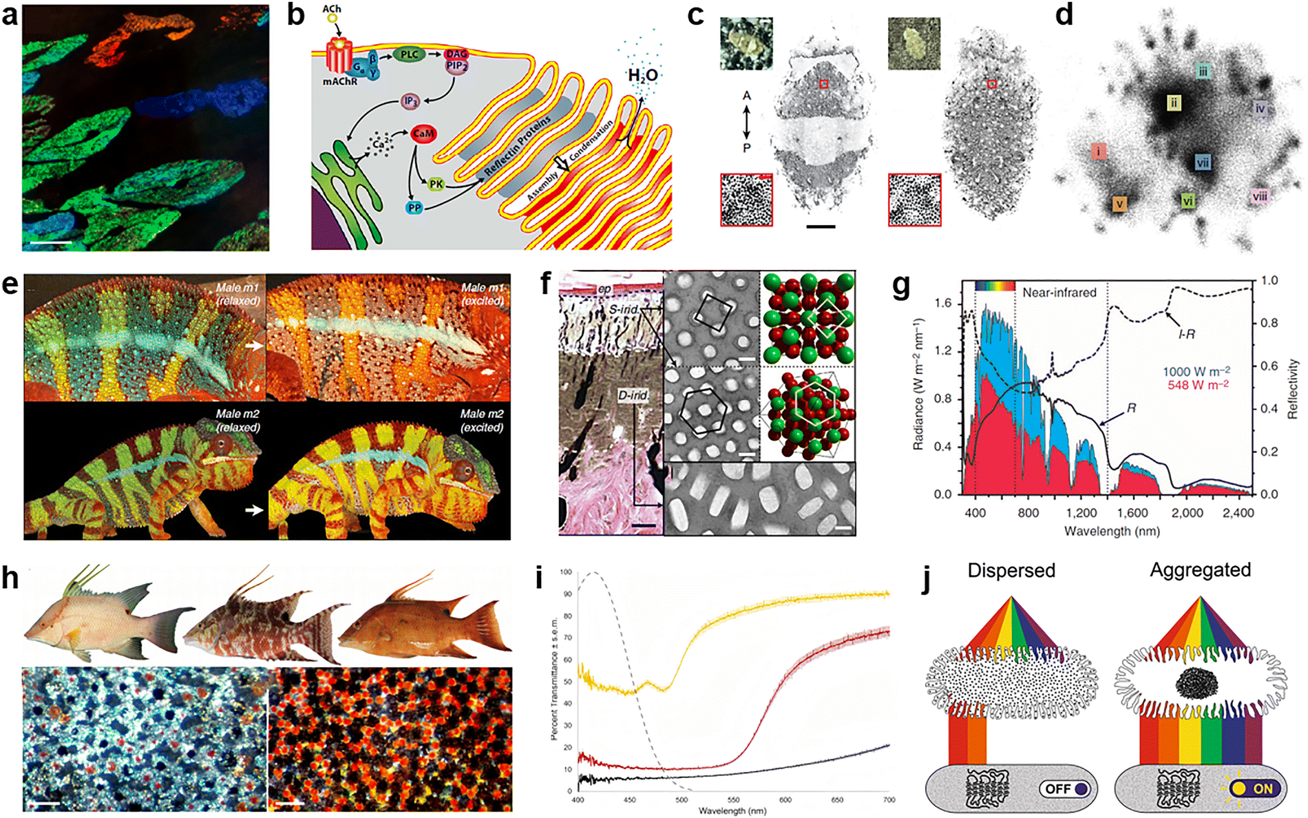 Panther chameleons’ skin comprises two overlapping dense layers of iridophore cells that contain guanine crystals with varying sizes, shapes, and arrangements. The configuration of materials with high and low refractive indices (nguanine = 1.83, ncytoplasm = 1.33) is accountable for the creation of a PhC. TEM micrographs reveal that guanine crystals are arranged in face-centered cubic lattices within the skin of a mature male chameleon (Fig. 10(f)). When subjected to an external stimulus, a shift towards longer wavelengths in the reflected light occurs as a result of the expansion of the nanocrystal spacing, leading to a change in color. Furthermore, research indicates that a denser distribution of iridophores containing larger crystals reflects a significant portion of sunlight, particularly in the near-infrared spectrum. Measurements demonstrate a notably high level of reflectivity in the near-infrared region, resulting in a substantial reduction in sunlight absorption. Panther chameleons screen 45% of the radiation energy in that spectral range through dermal reflection (Fig. 10(g)).156 Therefore, through the regulation of excitation and retraction, panther chameleons demonstrate the distinctive capacity to adjust the skin color reversibly, serving purposes such as camouflage, communication, or thermoregulation.157