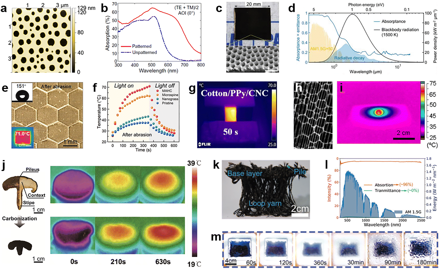 | Fig. 12 Bioinspired photonic materials for solar energy harvesting. (a), (b) A bioinspired patterned thin absorber. (a) Atomic force microscopy image of the a-Si:H thin film showing a short-range ordered hole distribution within the plane parallel to the surface. (b) Comparison of absorption spectra of thin-film photovoltaic absorbers with (red curve) and without (blue curve) disordered nanoholes. Reproduced with permission from ref. 117. Copyright (2017) CC BY-NC. (c), (d) A perfect absorber inspired by crab-eye. (c) Optical (upper panel) and SEM (lower panel) images of a fabricated prefect absorber. Scale bar: 1 μm. (d) Absorption spectrum (light blue curve) of the device in (c) showing broadband high absorption over the visible wavelengths. Reproduced with permission from ref. 174. Copyright (2024) Wiley-VCH. (e), (f) A photothermal icephobic surface inspired by cactus thorns for de-icing. (e) Optical image of the surface consisting of microspine arrays surrounded by honeycomb walls, along with the image of water droplet showing a large contact angle (upper left inset) and the infrared optical image of the device under 1 sun illumination (lower left inset) (f) Comparison of temperature variations of surfaces with different micro- and nano-structures. Reproduced with permission from ref. 182. Copyright (2023) Wiley-VCH. (g) Infrared optical image of dry photothermal fabrics under simulated sunlight. Reproduced with permission from ref. 185. Copyright (2025) Elsevier. (h), (i) CNT-butterfly wing composites for laser-induced remote heating. (h) SEM image of the CNT-butterfly wing composite. (i) Thermographic image of the surface of the composite under the irradiation of a 785 nm laser at ∼80 mW mm−2. Reproduced with permission from ref. 189. Copyright (2013) American Chemical Society. (j) Efficient solar steam generation can be achieved with natural (upper row) and carbonized (lower row) mushrooms by taking advantage of their unique heat behaviors under solar illumination. Reproduced with permission from ref. 190. Copyright (2017) Wiley-VCH. (k)–(m) Pistia-inspired photothermal fabric for low-cost vapor generation. (k) Image of the loop-pile fabric consisting of a base layer, piles, and loop yarns. (l) Absorption (orange curve) and transmittance (green curve) spectra of the fabric. (m) The vapor condensation behavior of a loop-pile fabric-based device in an outdoor experiment. Reproduced with permission from ref. 191. Copyright (2022) Wiley-VCH. | ||