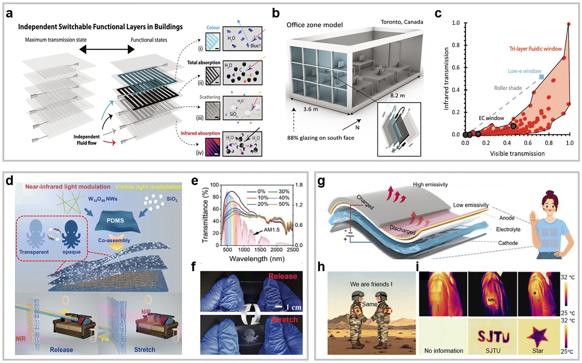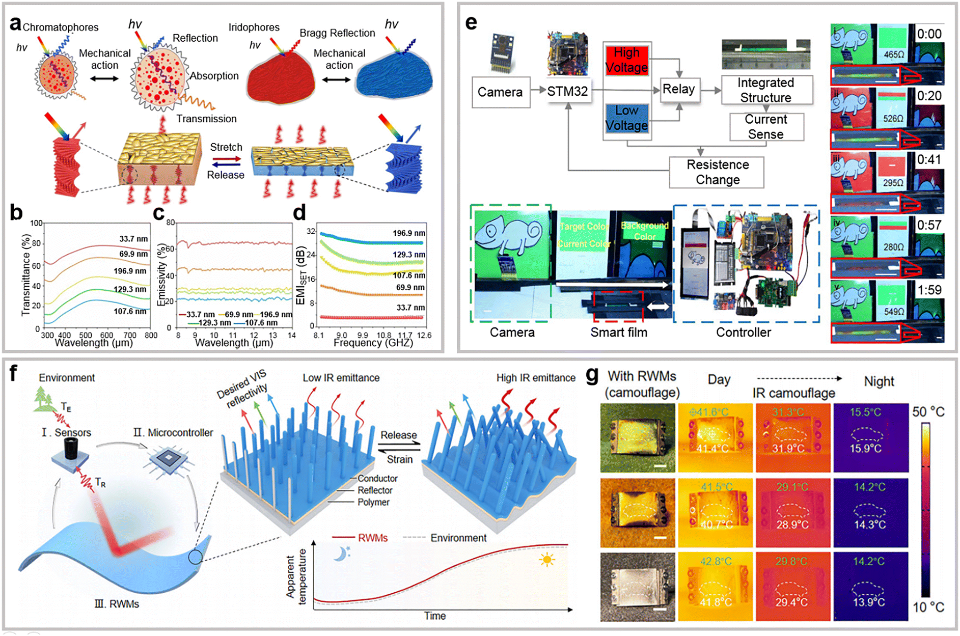 Fourth, most existing approaches to thermal control and camouflage are inherently static. For camouflage, the ability to conceal is typically limited to a specific ambient temperature or background color, making it difficult to achieve genuinely adaptive concealment in complex and unfamiliar environments. Likewise, current strategies of thermal management lack or are short in the capacity to respond dynamically to environmental changes. Future development could prioritize the creation of advanced adaptive thermal management systems that can tune their properties and functions autonomously, and ideally in real time, to react to the changing external conditions.141,234,240–243