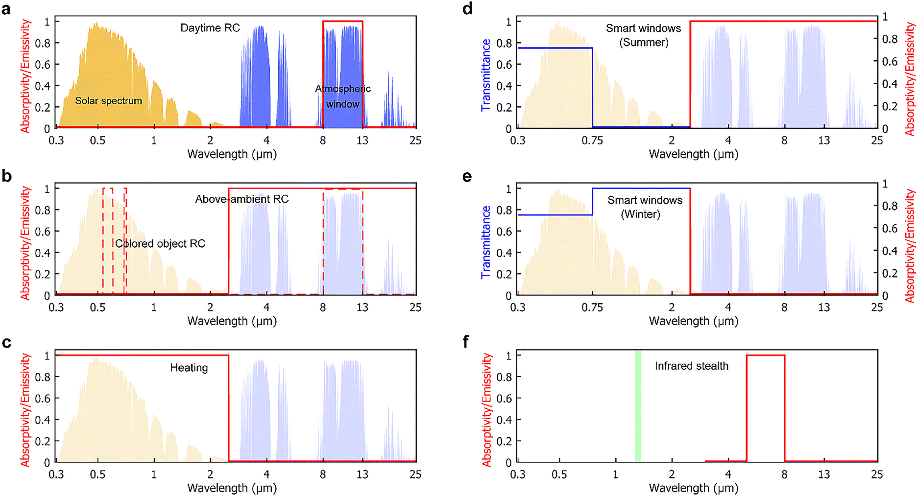 Besides the above scenarios involving sunlight, another compelling application requiring engineered thermal responses is IR stealth or camouflage. Although traditionally more efforts were put in optimizing the reflection directions of the incident NIR laser,35 recent research has suggested taking thermal effects into account as well.36 By overlapping the high emissivity band with the non-atmospheric window at 5–8 μm wavelength, the device could improve in thermal stability without sacrificing low IR detectability (Fig. 1(f)).