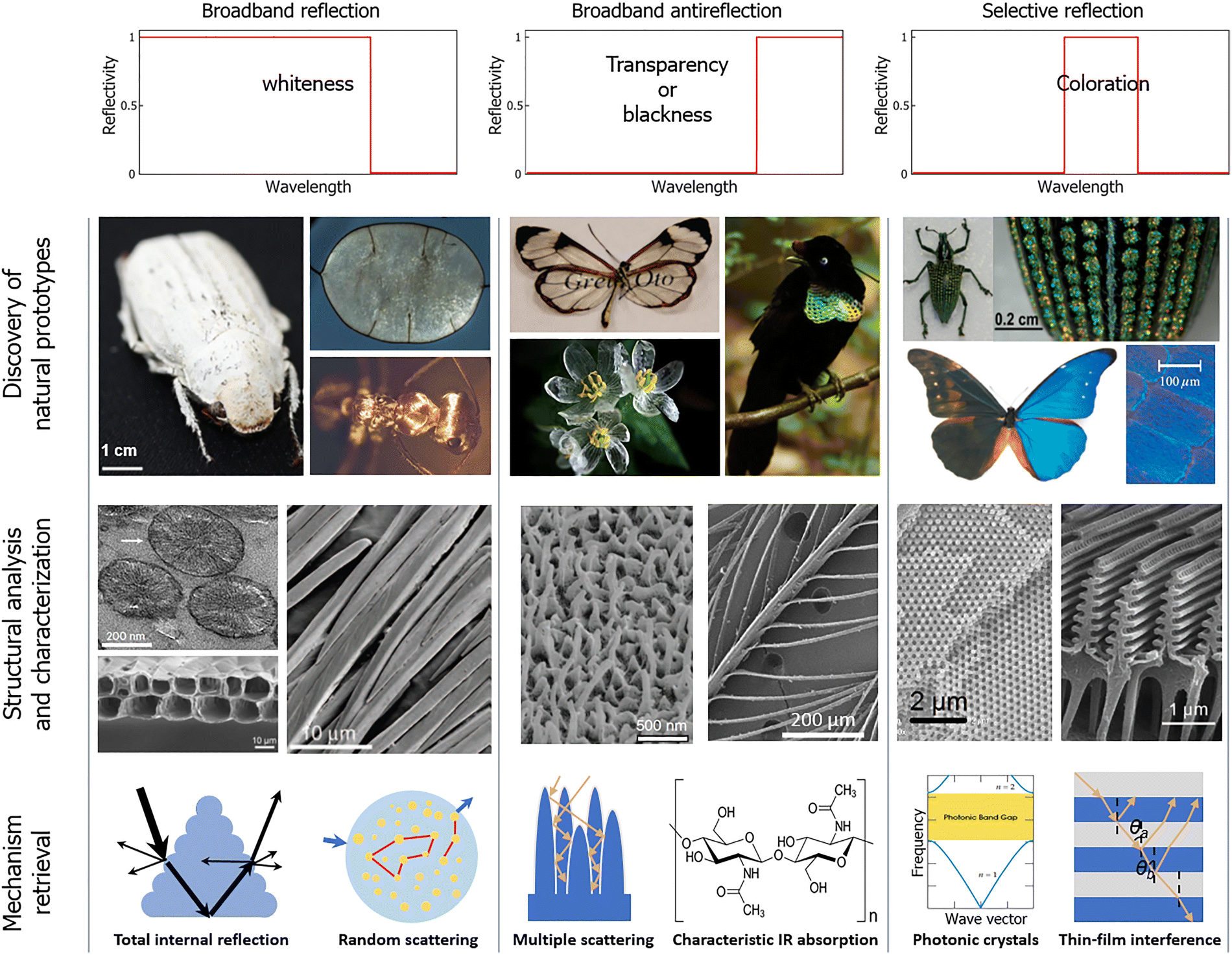 Interestingly, one possible solution may be just hidden in plain sight. Most if not all organisms can only live if their body temperature is within a relatively narrow range of temperatures. In other words, the need for thermal management is universal. Given the diversity of living organisms on Earth, numerous strategies, structures, and materials have been developed by nature through evolution, the ultimate and everlasting “optimization”, to perform various functions that help the organisms to better survive in the dynamically changing environment. Natural selection results in a comprehensive library of exceptional examples for human to explore, learn and imitate in engineering. When coming to thermal management, the process of biomimicry can be adapted in accord with the aforementioned features, inspecting primarily organisms inhabiting in hot or cold environments. And even with simultaneous requirements for ultrabroad bandwidths and critical band selectivity, instructive natural prototypes fulfilling both aspects have still been discovered. A well-known example is the Saharan silver ants capable of performing RC.37 More generally, as illustrated in Fig. 2, the search for inspiring prototypes can target one of the three characteristic responses to address the individual band-selective function. This approach is particularly effective in the visible region, where broadband reflection, antireflection, and selective reflection are manifested as whiteness, blackness, and coloration, respectively. On the other hand, the IR optical properties of biological structures are usually not visually perceivable with the naked eye. However, the physical mechanisms and design principles retrieved from analyzing colored functional organs are broadly applicable to the thermal wavelength range, still providing valuable guidance for engineering the IR part of the spectrum. Besides static spectral engineering, another important function that has inspiring solutions from nature is the active tuning of optical responses. Typical paradigms are species with the ability to change color, such as chameleons and cephalopods. To lay the basis for understanding bioinspired materials for thermal management, we discuss in the two succeeding sections illustrative examples of biological structures with static and dynamic optical properties, respectively.