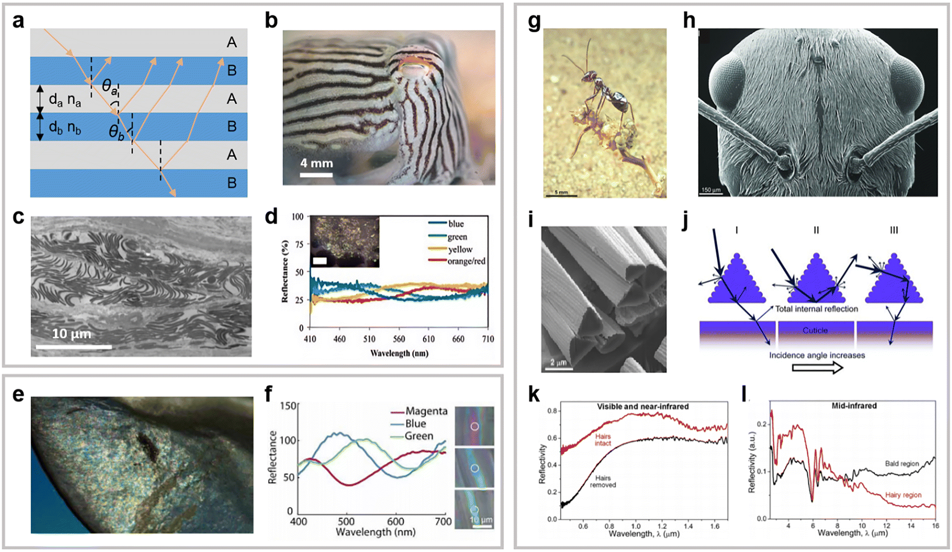 | Fig. 3 Multilayer structures and total internal reflection mechanism of biological static systems. (a) Schematic diagram of the multilayer model. (b)–(d) Diffuse white of Sepioloidea lineolata white stripe. (b) The white and dark stripes produced by iridophores and superficial brown chromatophores. (c) Transmission electron microscopy (TEM) composite image displaying the contents of iridophores and the morphology of Bragg stacks. (d) Changes in spectral reflectance within the visible wavelength range. Reproduced with permission from ref. 46. Copyright (2014) Wiley-VCH. (e), (f) Reflective appearance of the septum of Lunaria annua plant. (e) A close-up photograph of L. annua septum showing interference colors with a high degree of reflectivity over an area sized about a few square millimeters. (f) Spectra taken from single-colored regions reflecting magenta, blue, and green light, along with corresponding optical micrographs. Reproduced with permission from ref. 49. Copyright (2020) CC BY-NC. (g)–(l) Thermoregulatory mechanisms of the triangular hair of the Saharan silver ant. (g) The silver ants emitting a dazzling radiance in the African desert. (h) Scanning electron microscopy (SEM) image of the head covered with a uniform and dense layer of hairs. (i) Cross-sectional view of a silver ant's hairs milled by focused ion beams. (j) Schematic diagram illustrating the optical interaction between visible and NIR light and a hair at different angles of incidence. The two surfaces on the ripple could enhance diffuse reflection in the UV-visible range. (k) Hemispherical reflectance measured within the visible-NIR range. The hair-covered region (red curve) shows evidently higher reflectivity than regions with hairs removed (black curve). (l) Reflectance in the MIR range under normal incidence. Reproduced with permission from ref. 37. Copyright (2015) AAAS. | ||