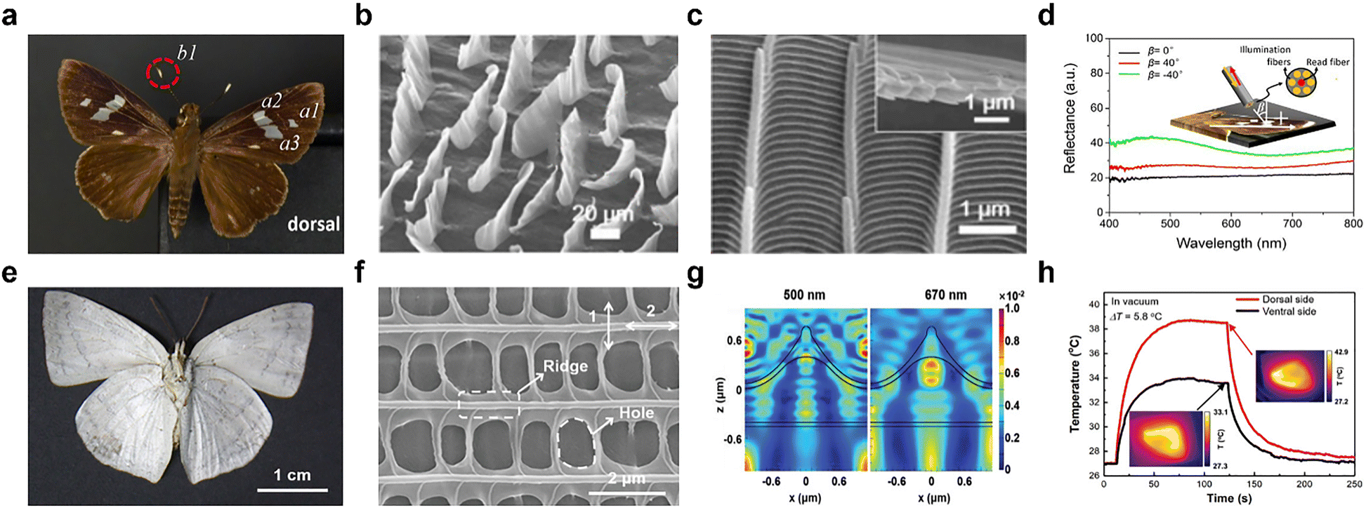 The production mechanism of white may also be the color mixing effect, such as red, green, blue superposition to produce white. Arising from the relationship between the intensity of reflected light and the angles of observation or incidence, structural whiteness can be categorized into two forms: diffuse whiteness (independent of angle) and metallic silver (angle-dependent).75,76 In the case of the former, light scattered by random media like particles, micropores, chitinous networks, and multidirectional plates retains its inherent colors regardless of the viewing angle. This diffuse whiteness can serve as a backdrop for colored patches, enhancing contrast and visual distinction, as seen in the white scales adorned with scattering beads of the pierid butterfly.76 However, there are very few documented instances of angle-dependent whiteness in butterflies. One prime example is the Costa Rican hesperiid butterfly, Carystoides escalantei, which showcases diverse manifestations of whiteness, encompassing both angle-dependent and angle-independent characteristics, evident on its wings and antennae (Fig. 5(a)).77 Ge and colleagues focused on the scales of angle-dependent spots, which are oriented vertically and exhibit variable tilting. These scales display undulating patterns resembling ripples and are composed of periodic ridges and ribs that run perpendicular to the ridges on both sides of the scale (Fig. 5(b) and (c)). The white coloration seems to result from the combination of diffracted colors originating from the hierarchical structure and the tilting of the scales. The angle-dependent scales amplify retro-reflection (Fig. 5(d)).77 This examination can potentially accelerate the advancement of materials that imitate structural whiteness, suitable for applications in sensing and low-energy consumption displays. The wing scales of the butterfly Argyrophorus argenteus,76 not just Carystoides escalantei, demonstrate exceptional broadband reflectivity with an extremely thin structure (thickness smaller than 1 μm). They feature a distinct variation in periodicity aligned parallel to the reflective surface rather than perpendicular to it. The unique coloration is due to a sub-micron scale design that generates broadband diffuse silver reflectivity through the addition of multiple colors. The combination of structural colors reflected from the membrane scale results in a transition from metallic to silvery white on certain butterfly wings. Liu et al. found that the ventral side of the butterfly Curetis acuta features highly improved broadband reflection from bright silver scales (Fig. 5(e)). This is due to the color mixing effect resulting from the irregular spacing and thickness of the laminated scales (Fig. 5(f) and (g)). In air, the maximum temperature difference is 2.4 °C, whereas in a vacuum (Fig. 5(d)), it reaches up to 5.8 °C as a result of the elimination of convective heat transfer (Fig. 5(h)).75 Seashells have bright whiteness that are considered to be ideally designed for display devices. Various species of giant clams employ two mechanisms to create white coloration, which are directly comparable to the RGB pixel strategy used in modern electro-optical technology. Both mechanisms are distinctive systems of structural color that achieve white through color mixing.78,79
