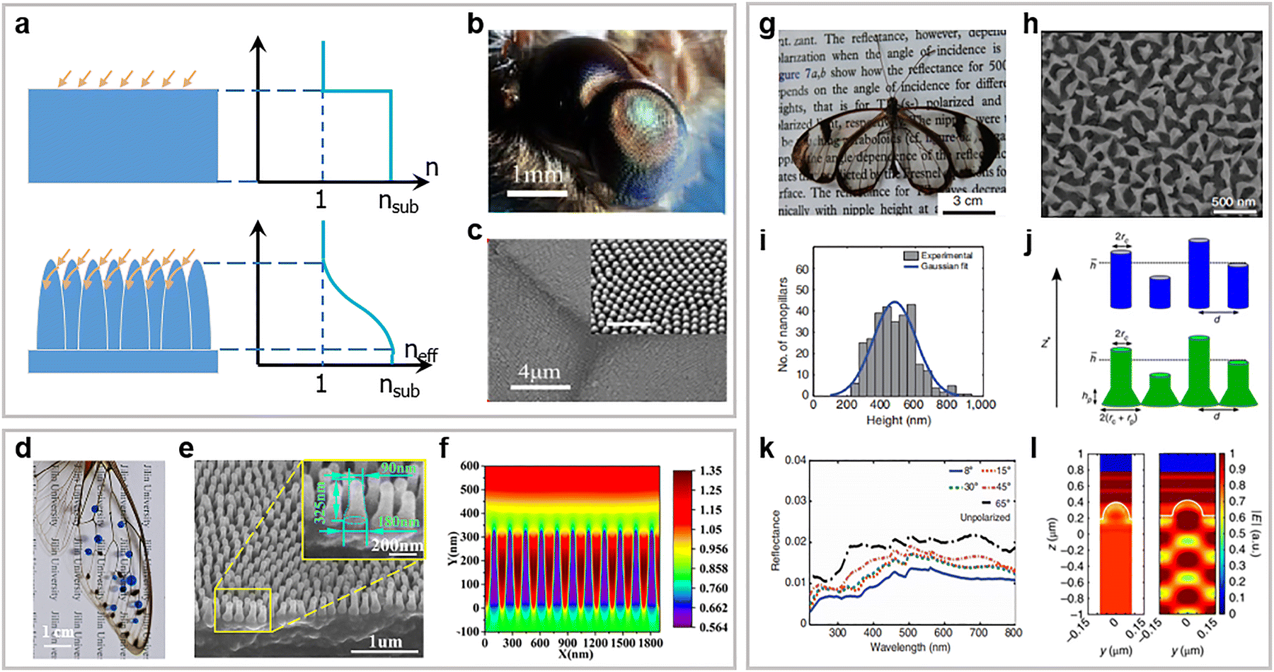 Fig. 6 Gradient index mechanism and disordered structures of biological static system: (a) Diagrams of the mechanism for antireflection of the moth eye and cicada wing. (b)–(f) Anti-reflection mechanism of periodic arrays in moth eyes and cicada wings. (b) Complete compound eyes of a moth and (c) SEM image of the details of ommatidia showing the top view of the surface. Inset is a close-up SEM image to show the sub-wavelength structure array in one ommatidium; scale bar: 1 μm. Reproduced with permission from ref. 92. Copyright (2018) CC BY. (d) Digital photograph of a cicada M. intermedia wing, with droplets on it to show hydrophobicity, placed on a sheet of paper. (e) Magnified image of a cicada wing. (f) Simulated electric field profile for the cicada wing. Reproduced with permission from ref. 95. Copyright (2019) American Chemical Society. (g)–(l) Random nanostructures for the omnidirectional anti-reflection properties of the glasswing butterfly. (g) The wings of the glasswing butterfly (Greta oto) are comprised of three distinct regions, including transparent, deep brown, and white sections. (h) The top perspective reveals the seemingly haphazard arrangement of the columns, a pattern supported by the 2D Fourier power spectrum of the nanostructure positions derived from this SEM image. (i) A statistical analysis of the nanostructure height in the transparent region on the dorsal side of the butterfly wing. (j) The established model diagram of the anti-reflection structure. The glass wing structure is modeled using nanorods with fixed radius but randomly distributed heights. (k) The omnidirectional and broadband reflection in the visible light range. Reproduced with permission from ref. 101. Copyright (2015) Springer Nature. (l) Finite-difference time-domain simulations were utilized to examine the near-field scattering profile in the postdiscal and basal regions at the wavelength of 420 nm. Reproduced with permission from ref. 102. Copyright (2018) Springer Nature. | ||