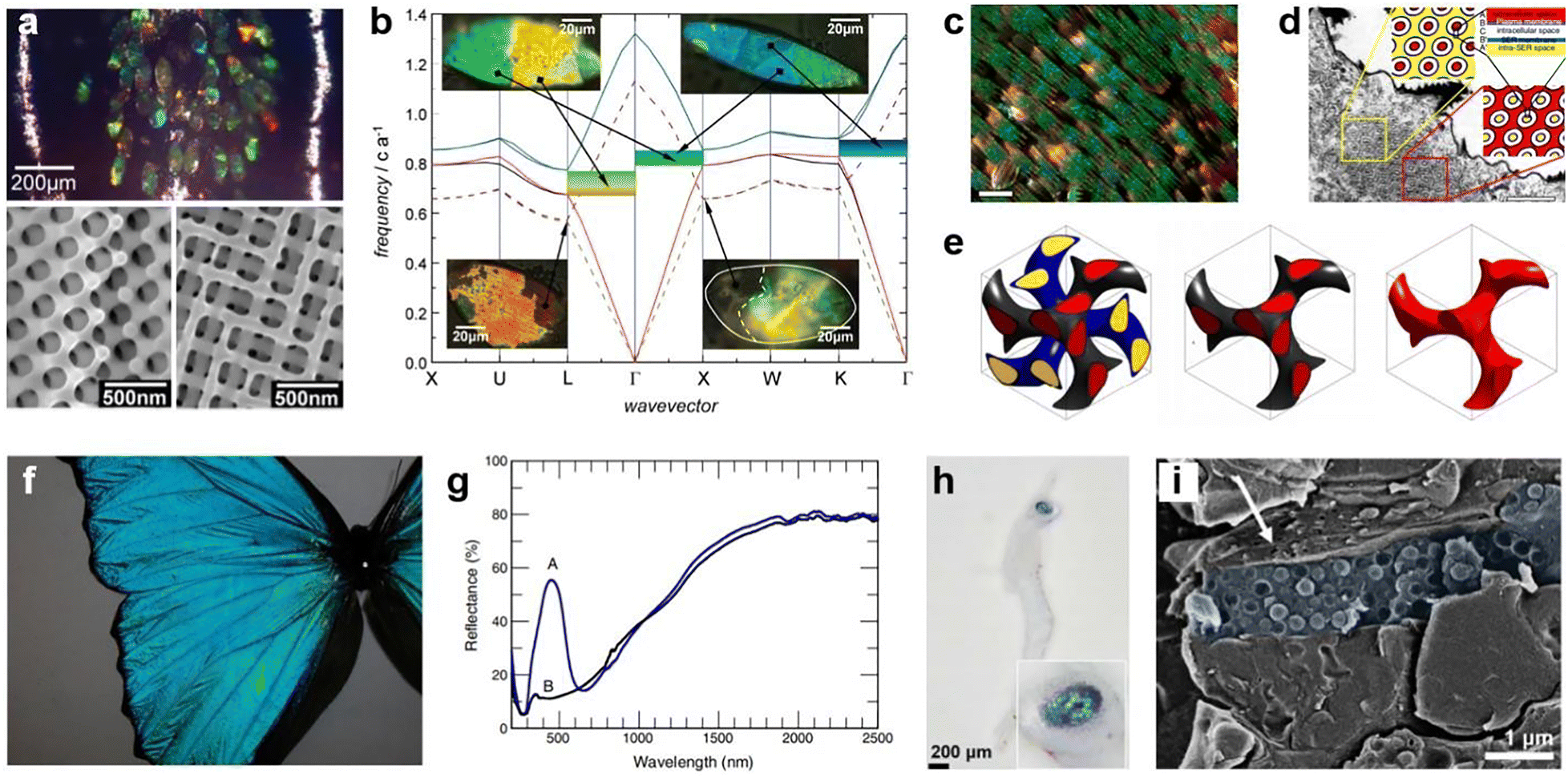 | Fig. 8 Natural photonic crystals in beetles (a), (b) and butterflies (c)–(g) and biological glasses in shrimps (h), (i). (a) Microscopy image (top panel) of the scales covering the elytra of neotropical weevil, Entimus imperialis and SEM images showing the 3D PhCs in the green/yellow domain (lower left/right panel). (b) Calculated photonic band structure for the colored (solid lines) and colorless (dashed lines) regions in the scales of E. imperialis in (a). Reproduced with permission from ref. 128. Copyright (2013) Wiley-VCH. (c)–(e) 3D gyroid PhCs in butterfly wing scales. (c) Optical micrograph of the ventral wing scales of the butterfly Callophrys gryneus (scale bar: 100 μm). (d) TEM image of a wing scale cell from a developing pupa of Callophrys gryneus (scale bar: 1 μm) showing concentric rings arranged in a triangular lattice. (e) Unite cell model showing the development of the wing scale cell. From left to right: core–shell double gyroid structure, core–shell single gyroid, and single gyroid network of chitin. Reproduced with permission from ref. 129. Copyright (2010) National Academy of Sciences. (f) Image of the top surface of a butterfly Morpho didius wing and (g) its total reflectance (curve A) in comparison to that of the bottom surface (curve B). Reproduced with permission from ref. 130. Copyright (2011) Elsevier. (h) Polarized optical micrograph of a zoea of caridean shrimp (inset: zoom-in image of the eyes), and (i) Cryo-SEM image of the reflector cells for the color blue. Average particle size: ∼247 nm. Reproduced with permission from ref. 132. Copyright (2023) AAAS. | ||