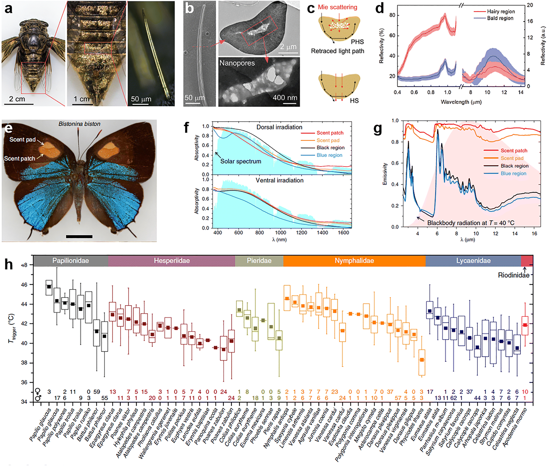 | Fig. 9 Biological examples of radiative cooling in cicadas (a)–(d) and butterflies (e)–(h). (a) Photographs of a female Cryptotympana atrata (left and center) and of a single golden microspike of it (right). (b) SEM (left) and TEM (right) images of the microspike in (a). (c) Schematic illustrating a microspike with porous heart-shaped inner structures on its cross-sectional plane and how Mie scattering of visible light by such pores helps to enhance the backscattering efficiency of microspikes. (d) Comparisons of measured reflectivity spectra in the vis-NIR and MIR regions for hairy (in red) and bald (in blue) areas. Reproduced with permission from ref. 138. Copyright (2021) Wiley-VCH. (e) Photograph of a male Bistonina biston, showing four colors on the dorsal forewing surface corresponding to four types of wing scales. Scale bar: 5 mm. (f), (g) Solar absorption (f) and thermal emissivity spectra (g) measured from different regions of the Bistonina biston forewing. Data are overlaid on a normalized solar spectrum and the normalized thermal radiation spectrum of a blackbody at 40 °C, respectively. (h) A box plot of the temperatures that start to trigger displacement responses of butterflies. The comparison is made across 50 species in 6 families (see legends on the upper boundary). Reproduced with permission from ref. 140. Copyright (2020) CC BY. | ||