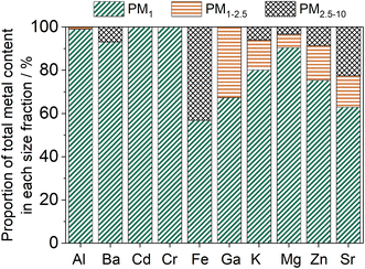 Extractable metals: a closed vessel microwave digestion system (Multiwave 3000, MF100 drum, Anton Parr) was used for the digestion and extraction of elements from the particle samples collected using the PM10 Impactor (cut-off points of 10, 2.5, and 1 μm). Prior to their use, the microwave vessels were soaked overnight in 10% nitric acid (HNO3) to remove any contamination. The microwave protocol was adapted from previously validated methods that are stated in literature.87 Briefly, half of each filter underwent HNO3 (68%) microwave digestion. The microwave was set to 3 min ramp to 95 °C, 5 min hold, 3 min ramp 120 °C, 5 min hold, 3 min ramp to 130 °C, and 2 min hold to extract the elements. A diluted extracted solution was filtered through a 0.45 μm cellulose membrane filter prior to being analysed by ICP-OES (Avio 500, PerkinElmer) for the determination of the concentrations of 18 elements: Al, B, Bi, Ba, Cd, Co, Cr, Cu, Fe, Mg, In, Ga, Mn, Ni, K, Sr, Pb, and Zn. The concentration of the metals is presented as an average of the nine collections with their associated standard error. The limit of detection and quantification for each element is shown in Table S-4.† Certain elements, such as B, Bi, Pb, Ni, In, Cu, Co, and Mn were not detected, or their concentration were below the quantification limit.