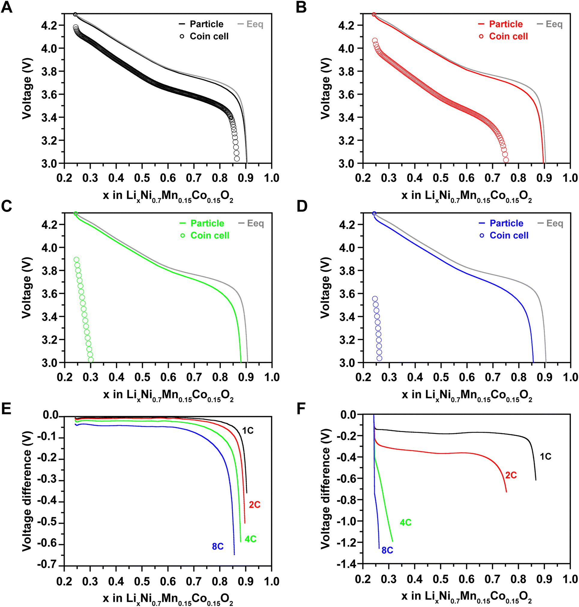 When the C-rates were increased to 2C (30 minutes), 4C (15 minutes), and 8C (7.5 minutes), the particle showed overpotentials of 0.0142 V, 0.0244 V, and 0.0405 V, respectively, at x = 0.24 in LixNi0.7Mn0.15Co0.15O2, while the coin cell exhibited 18–20 times higher overpotentials of 0.2538 V, 0.4505 V, and 0.8234 V, respectively. The capacities of the coin cell were decreased by 23.89%, 89.23%, and 96.95% compared to the equilibrium potential at 2C, 4C, and 8C, respectively. This demonstrates the difficulty in fully charging within 15 minutes at the cell level, although the particle results indicate the possibility of fast charging. Therefore, to achieve fast charging at the cell level, we need to closely analyze and bridge the gap between particle and cell performance. In coin cells, the overpotentials are significantly affected by both the anode and the cathode. In this study, since lithium metal is used as the anode and its overvoltage is assumed to be constant, the analysis is focused on the cathode.