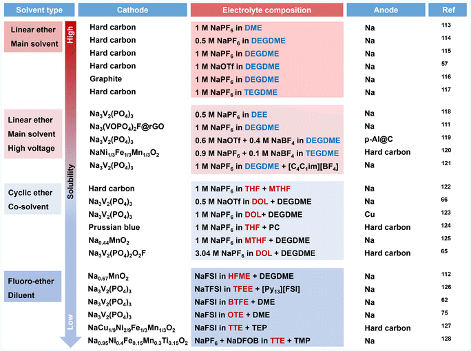 Ether can be applied independently as an electrolyte solvent, in a mixture of more than two ethers, or as a diluent. Representative formulations of ether-based electrolytes for SIBs are summarized in Fig. 6, along with the corresponding cathodes and anodes. From top to bottom are linear ether, cyclic ether and fluorinated ether. Linear ether is mostly used alone due to its high solubility and moderate solvation ability, and is typically paired with HC or sodium metal anodes, and polyanionic and layered oxide cathodes. Research indicates that HC in linear ether demonstrates excellent rate performances and low-temperature performances, with discharge capacities significantly higher than those in ester-based electrolyte at large current density and low temperature, resulting in its kinetic advantage.109 When linear ethers are matched with high-voltage cathodes, co-salts such as NaBF4 are often added to derivatize a stable CEI to enhance the high-voltage stability.110