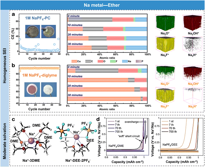 The compatibility of ether-based electrolytes with Na metal is mainly demonstrated by high coulombic efficiency and long cycle life, achieved by uniform Na depositing/stripping. This performance is critically dependent on a uniform and thin SEI and a moderate Na+–ether solvation structure.151 The representative ester-based electrolyte of 1 M NaPF6-PC and ether-based electrolyte of 1 M NaPF6-DEGDME in Na/Cu cells are shown in Fig. 9(a). Obviously, in 1 M NaPF6-PC, Na/Cu cells present very low coulombic efficiency (less than 20%), demonstrating poor Na deposition reversibility. In sharp contrast, the average coulombic efficiency of Na/Cu cell cycled in 1 M NaPF6-diglyme is close to 100% (Fig. 9(b)). Large amounts of NaH are distributed across the surface and bulk body of “dead deposits” when cycled in 1 M NaPF6-PC, while only a small amount of NaH is observed at the surface of “dead deposits” when cycled in 1 M NaPF6-diglyme. Significantly, Kim et al. reported that152 compared to fluorine-containing ester-based electrolyte (1 M NaClO4 in EC/PC + 5 wt% FEC), an ether-based electrolyte (1 M NaBH4 in DEGDME) facilitated the formation of NaH, which is considered a favorable SEI component due to its excellent mechanical properties and electronic insulation. Specifically, the native oxide surface of sodium was converted into NaH and NaBO2 after soaking in the electrolytes, implying that “SEI reconstruction” occurred by chemical reduction. Accordingly, the Na/Na symmetric cell exhibited significantly extended cycling stability (1200 h, 1 mA cm−2, 1 mA h cm−2) compared to the fluorine-containing ester-based electrolyte (300 h for 1 M NaClO4 in EC/PC + 5wt% FEC). However, the precise quantity and formation mechanism of NaH, as well as its impact on cell performance, remain to be elucidated.