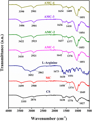 | | Fig. 1 FTIR spectra of CS, MC, L-arginine, AMC-1 (control) and AMC-2, AMC-3, AMC-4 active films. | |