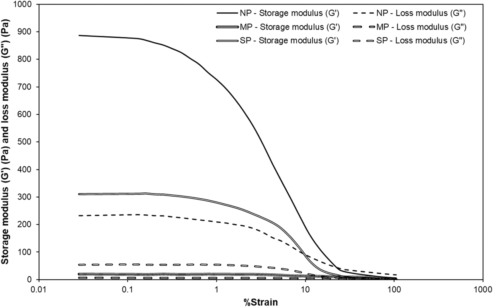 | | Fig. 11 Comparison of storage modulus G′ (Pa) and loss modulus G′′ (Pa) under strain sweep from 0.1 to 100% of 10% (w/w) of three heat-induced protein gels. NP – Nannochloropsis oceanica protein, MP – Milk protein, and SP – Soybean protein. | |