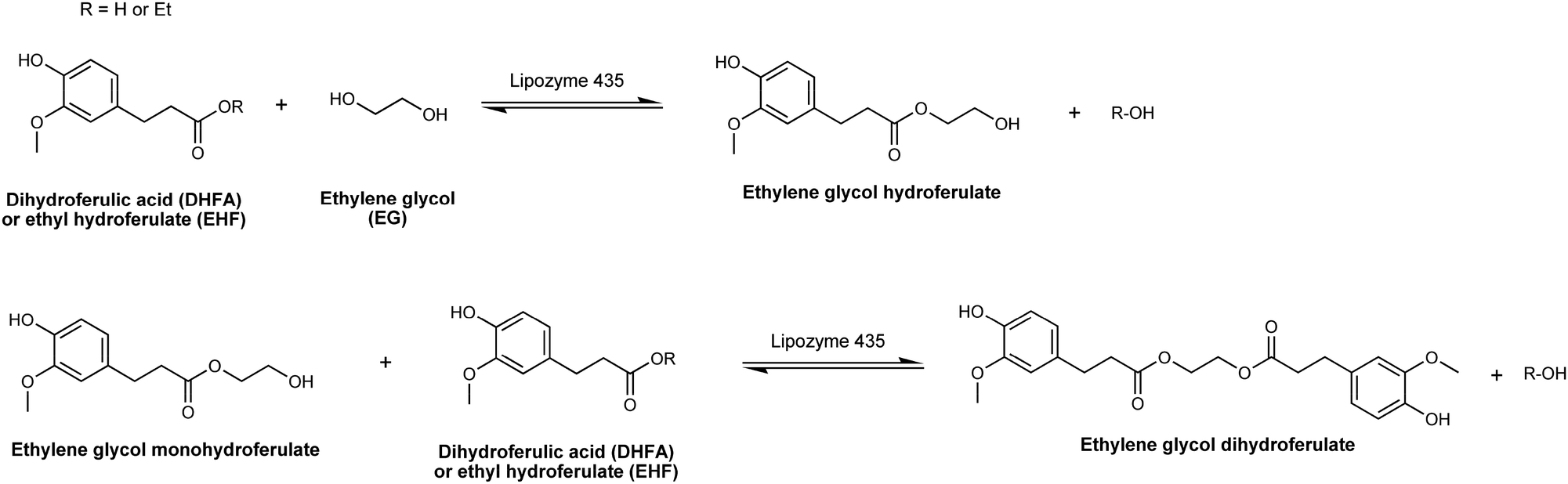 | | Scheme 1 Reaction between ethylene glycol and hydroferulate acyl donors (dihydroferulic acid or ethyl hydroferulate). | |
