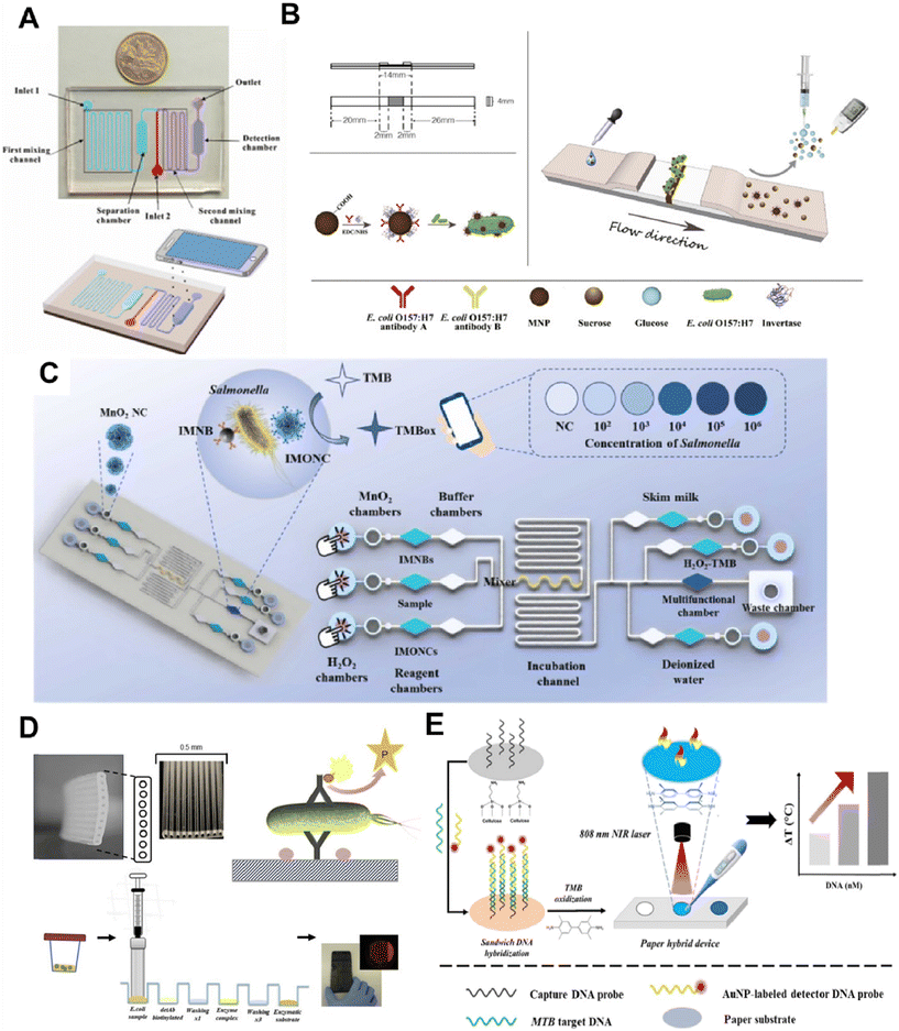 Fig. 4 Method of POCT for pathogen bacteria detection. A) the proposed colourimetric biosensor for rapid detection of E. coli O157:H7 based on gold nanoparticle aggregation and smartphone imaging. The image is reproduced from ref. 52 with permission from Elsevier, copyright 2019. B) A portable and quantitative point-of-care monitoring system for E. coli O157:H7 using a personal glucose meter is achieved through an immunochromatographic assay. The image is reproduced from ref. 55 with permission from Elsevier, copyright 2018. C) Principle of the microfluidic biosensor for POCT of Salmonella. The image is reproduced from ref. 56 with permission from Elsevier, copyright 2023. D) The microcapillary platform was utilised to develop a quantitative fluorescent immunoassay for E. coli detection. The image is reproduced from ref. 57 with permission from Elsevier, copyright 2019. E) The working principle of the photothermal biosensing of MTB target DNA on a paper hybrid device. The image is reproduced from a ref. 59 licensed by CC BY 3.0.
