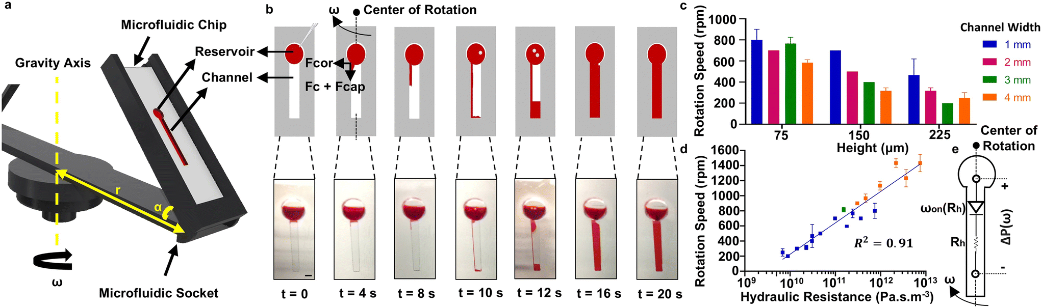 | | Fig. 1 Principle of the Spinochip technology. (a) Rotating platform mounted on a spin-coater to fill dead-end microfluidic channels. The socket angle α is 45°, the distance of the socket from the rotation center r is 108.4 mm and ω is the rotation speed in the clockwise direction. (b) Illustrations and corresponding photographs of the channel during filling with spinning at 500 rpm. The forces applied in the centrifugal microfluidic channel, Fc, Fcor and Fcap, create air pressure inside the channel. Air in the channel escapes towards the reservoir (t = 10 s) and the channel is filled with the sample. Scale bar is 3 mm. (c) Required minimum rotation speed for filling channels with 25 mm length but different widths and heights. (d) The relation of the hydraulic resistance of the channels with the required minimum rotational speed for filling. All characterization tests were performed on microfluidic chips fabricated using PMMA. Trials were conducted with different viscosity samples (1–10 cP). Blue, green and orange points represent 1 cP, 5 cP and 10 cP samples, respectively. Error bars are standard deviations from three experiments. 500 rpm rotation speed corresponds to 29.12g force in the platform. (e) The equivalent circuit diagram of a dead-end microfluidic channel with a single reservoir. | |