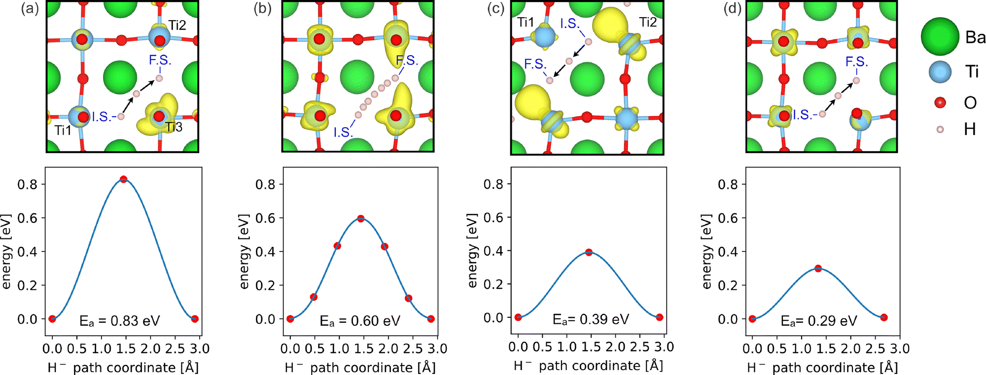 , Ea is reduced. Conversely, when the doping electron remains localized during migration, as favored by the presence of an electron polaron, Ea increases. Interestingly, even in the presence of a localized doping electron, we find that Ea can still be reduced if the electron migrates in the same direction as H−, as enabled by the periodic arrangement of
