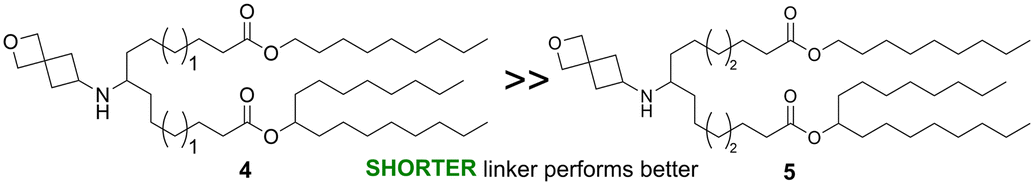 In addition to looking at the placement of the carbon branching, we were interested to probe how sensitive nonsymmetric tail lipids were to alcohol chain length. In lipid 12, it was observed that the use of 1-methyl-hexan-1-ol led to a potent lipid (4-fold increase of expression vs. MC3, P < 0.0001). To explore this approach further, lipids 13 and 14 were synthesized with nonidentical linker lengths allowing for the alcohol length to be modulated within compounds that are structural isomers of lipids 7, 15, and 16. The synthesis of 13 and 14 required an alternative synthetic approach that is described in the ESI.† As compared to lipid 7, in lipid 13 a C2H4 fragment is moved from the tail to the linker region, whereas in lipid 14, a C2H4 fragment is moved from the linker to the tail region. Compared to MC3, both 13 (5-fold increase in expression vs. MC3, P < 0.0001) and 14 (3-fold increase in expression vs. MC3, P = 0.0028) performed well, with 13 trending toward higher protein expression. These results suggest varying linker and alcohol tail length simultaneously may be a strategy to further improve lipid activity. Additionally, variation of the alcohol tail length may be a strategy to control lipid biodegradability as it has been reported that the combination of a longer linker and shorter alcohol tail can lead to more rapid lipid biodegradations, a property that is associated with improved safety.16,22