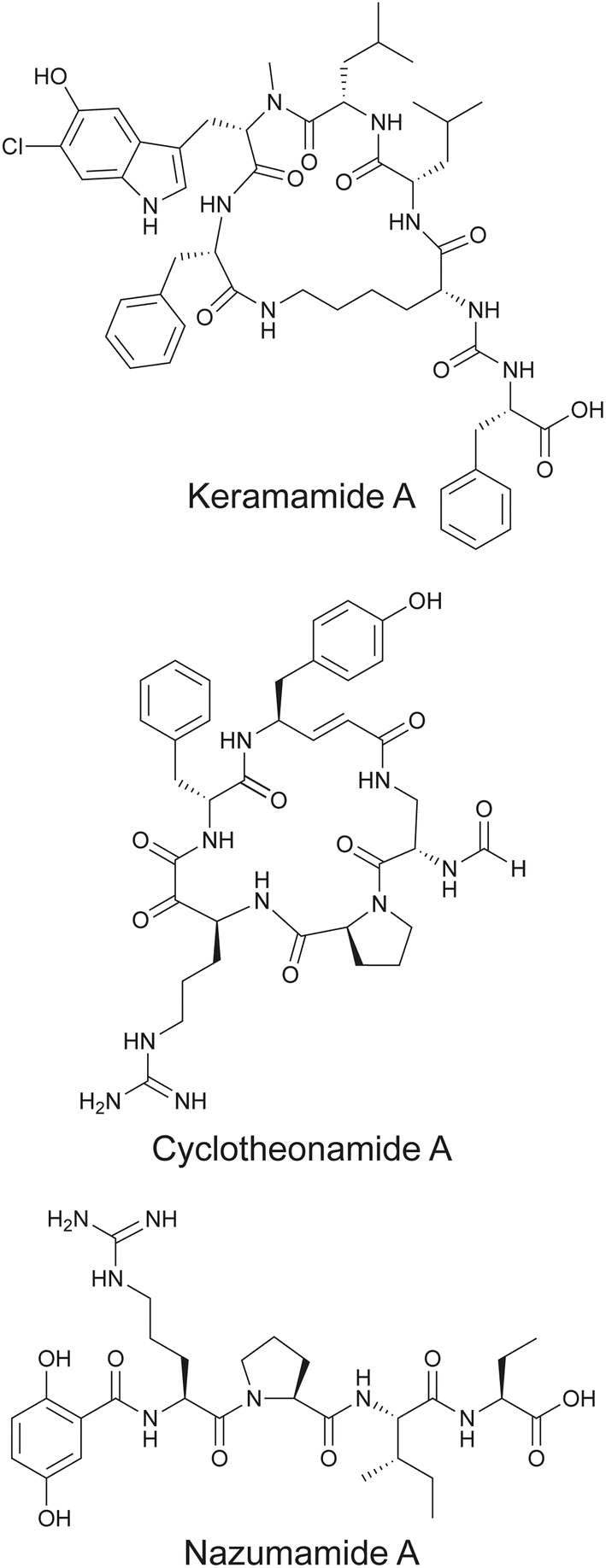 Fig. 11 Representative keramamide and cyclotheonamide congener structures, along with nazumamide A isolated from Theonella sponges.