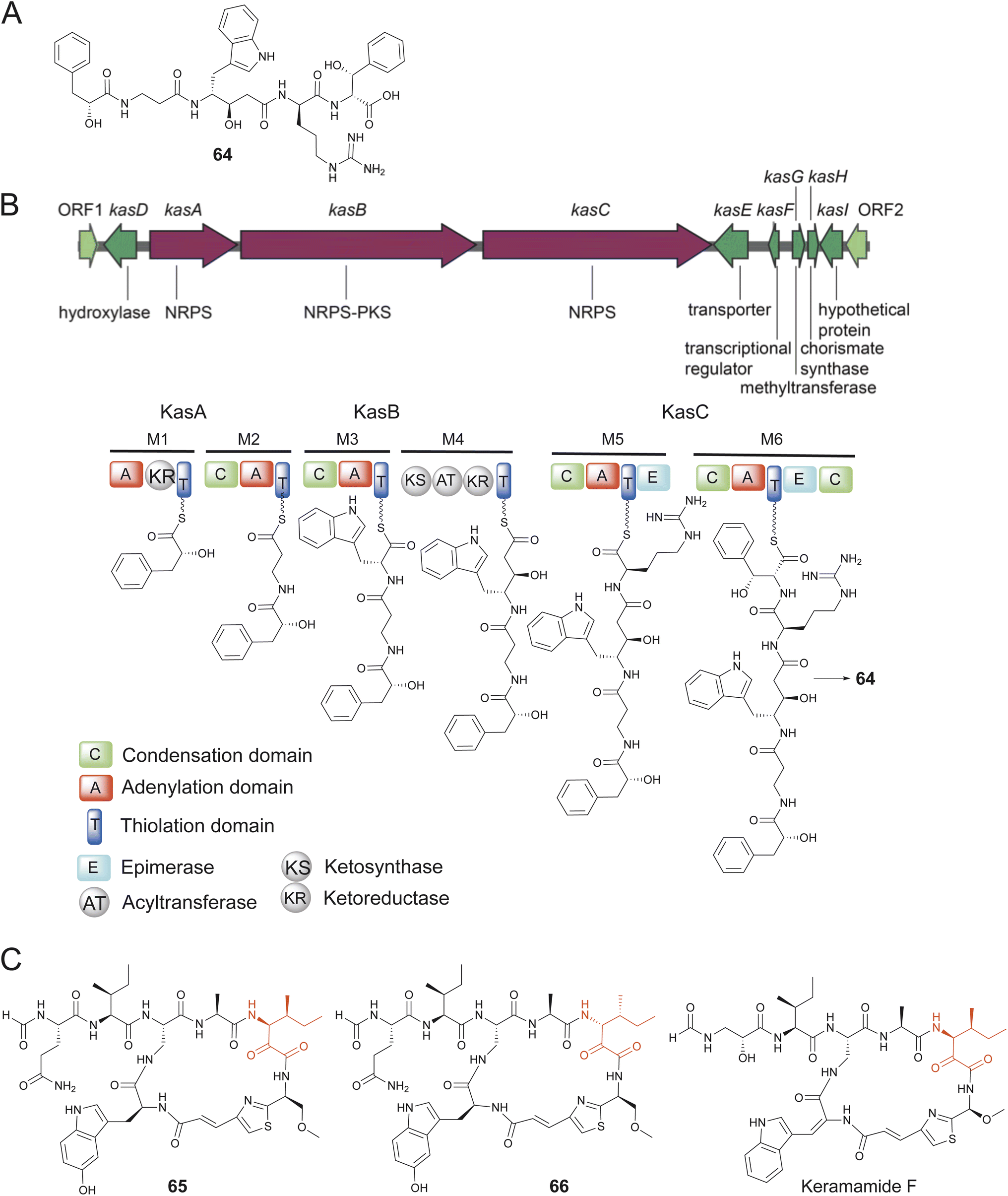 Fig. 13 (A) Structure of 64. (B) The assembly line biosynthesis of 64 as predicted by the organization of the kas BGC. (C) Structures of 65 and 66 and similarity to keramamide F.