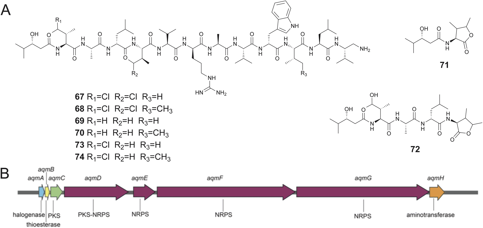 Fig. 14 (A) Structures of aquimarins 67–74. (B) The aqm BGC.