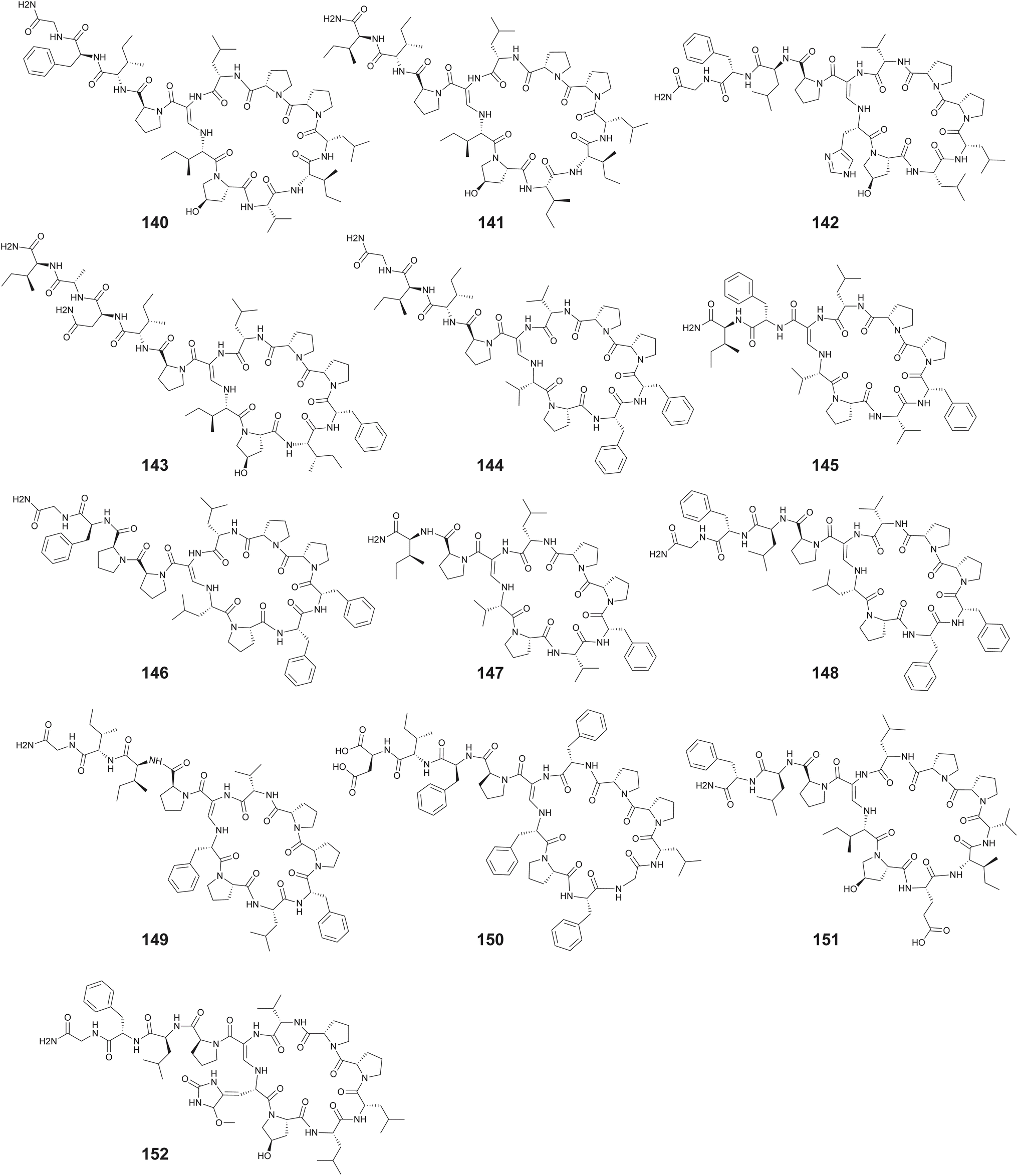 2.1.1. Proline-rich macrocyclic peptides (PRMPs). The proline-rich macrocyclic peptides (PRMPs) are a group of pNPs that are head-to-tail macrocyclized by amide bond formation between the peptide main chain N-terminal primary amine and the C-terminal carboxylic acid. The PRMP macrocycle typically comprises of six to eight proteinogenic amino acids with multiple Pro residues. Amino acids with non-polar or aromatic side chains dominate the PRMP sequences with minimal modifications afforded upon the amino acid side chains.60 The presence of Pro units constrains the peptide backbone flexibility provides higher affinity and selectivity for binding to their molecular targets.61,62