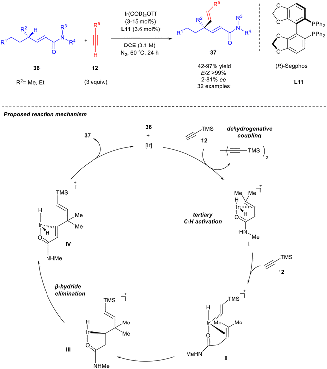| Scheme 13 Regio- and stereo-selective Ir-catalysed addition of a tertiary allylic C–H bond of α,β-unsaturated amides 36 to alkynes 12. | ||
